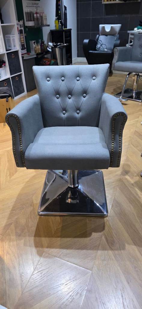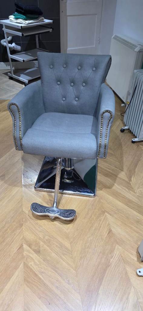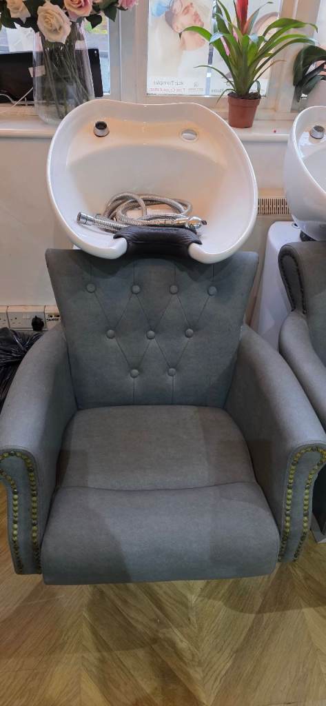 x2 hairdressing wash basins. Backwash basins. In grey and white plus x3 matching chairs, 1 black. good working condition. No tears on leather. Hydraulic pump chairs, with footrest