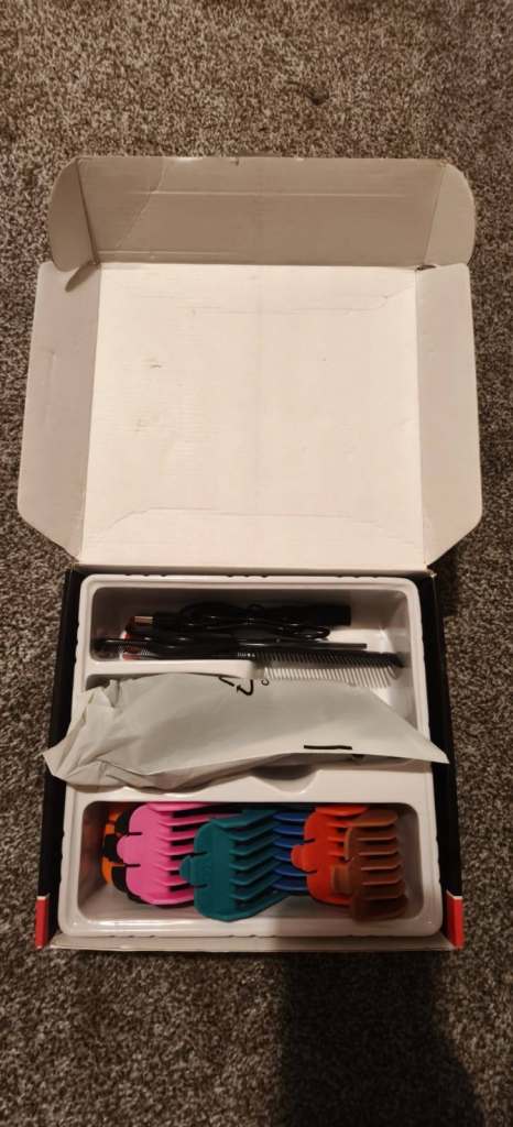 Husband don't like it All attachments for the clippers in box. Different sizes below