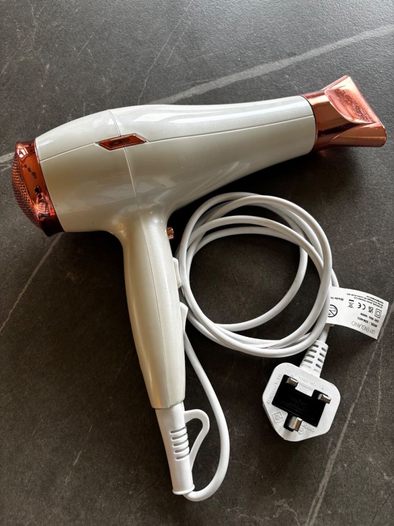 Supersonic Hair Dryer in Prussian Blue & Rich Copper is a high-quality hair styling device that offers a sleek and powerful solution for achieving salon-quality results at home. With three speed settings and a powerful 1600W motor, this hair dryer can quickly and efficiently dry and style your hair. Its compact dimensions of 77 × 288.3 × 97.8 mm make it easy to use and store, while the attractive colour scheme adds a touch of sophistication to your vanity or dressing table.