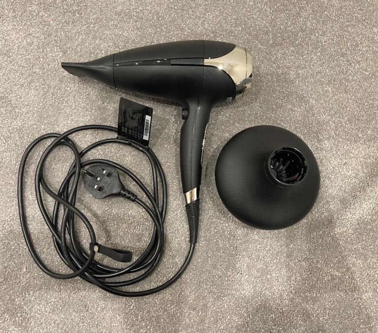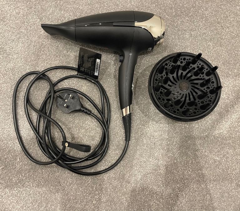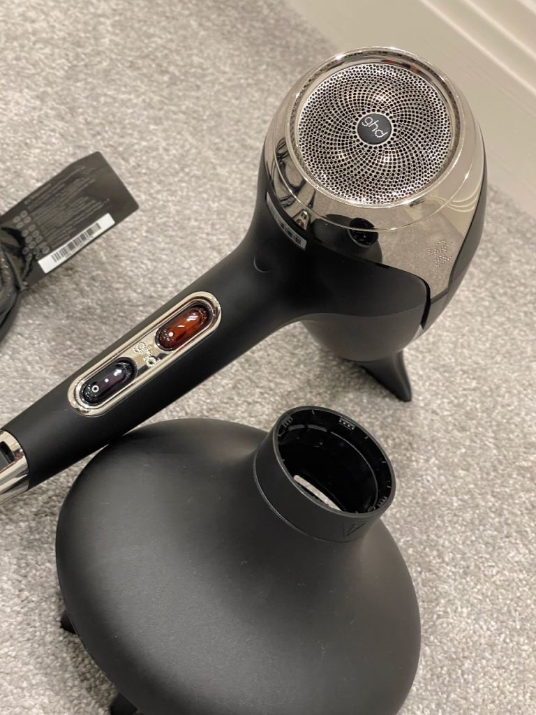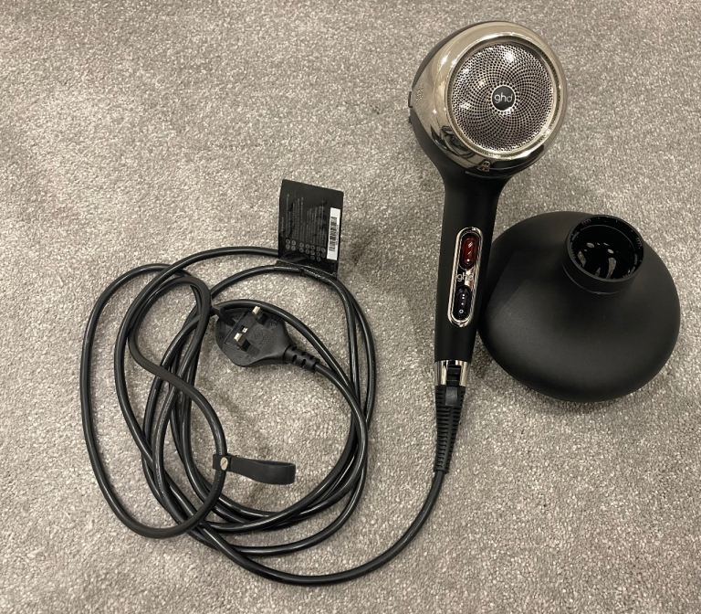 GHD Helios Professional Hair Dryer in black is a top-quality styling device designed for both men and women. With adjustable heat settings, three different speeds, and a sleek plastic material, this hair dryer offers professional-grade performance in the comfort of your own home. The included nozzle and diffuser allows for targeted styling, making it versatile for a variety of hair types and styles. This electric-powered hair dryer comes in its original box, with original box for diffuser making it a perfect addition to your hair care and styling routine. As good as new