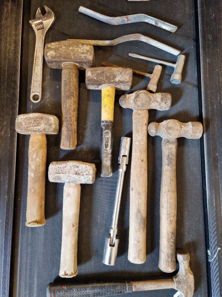 Mash hammers, chisels, claw hammer, pointing keys, herras fence key, adjustable and stihl saw keys.