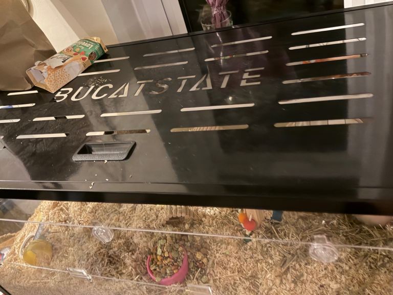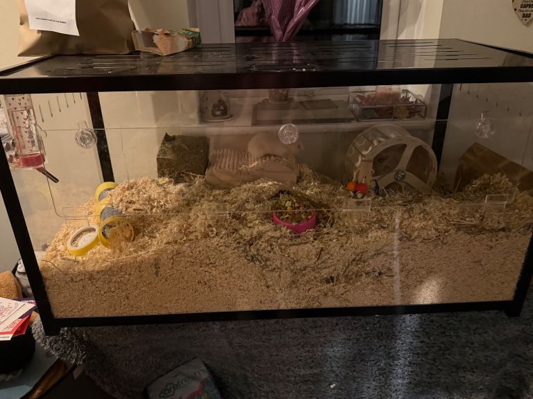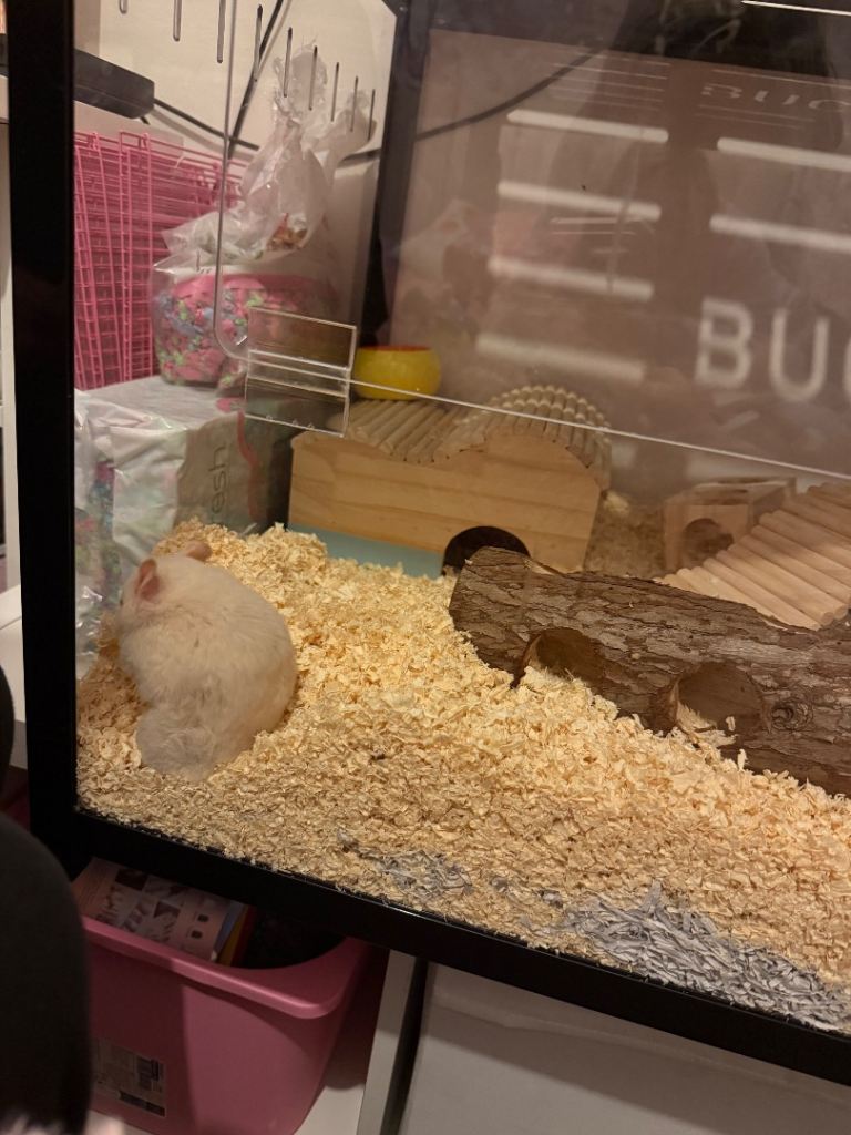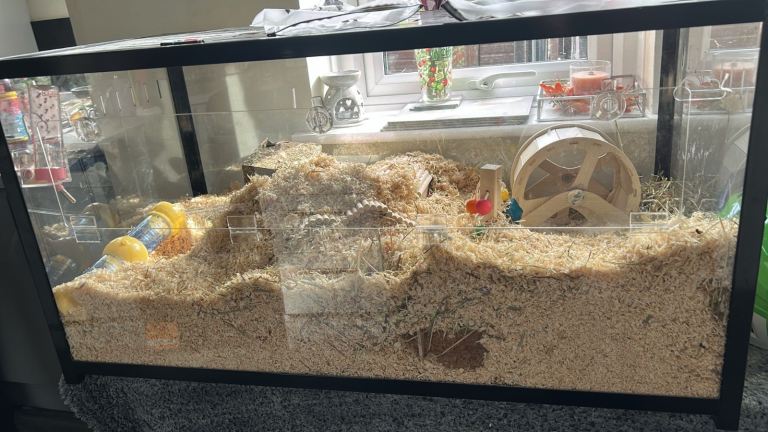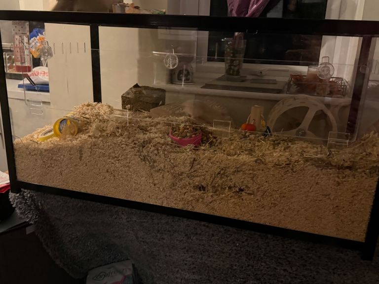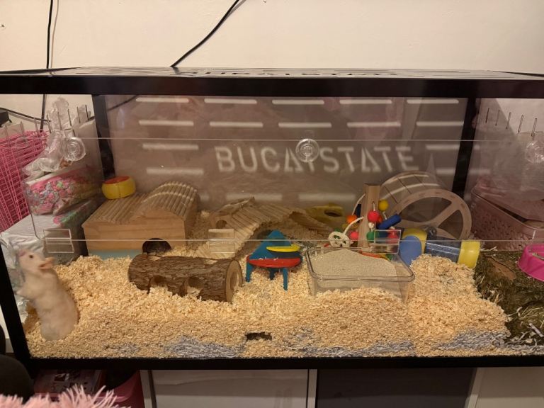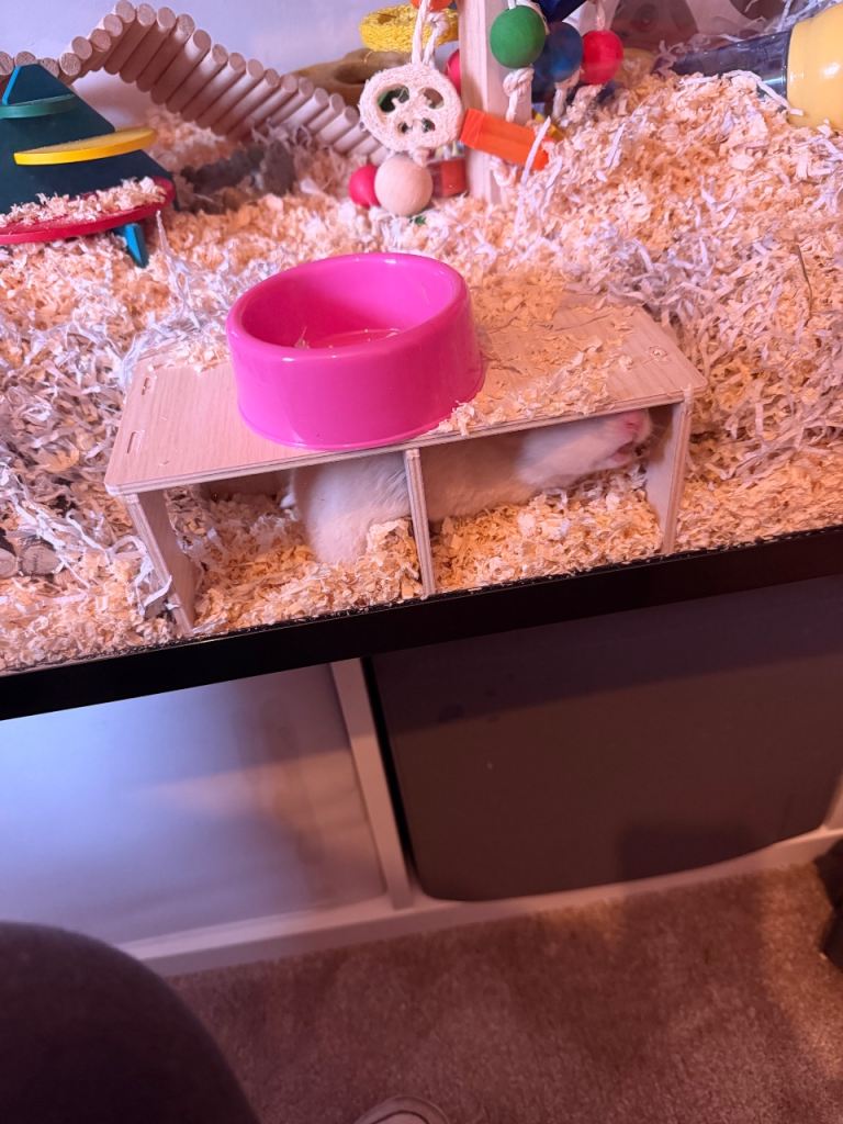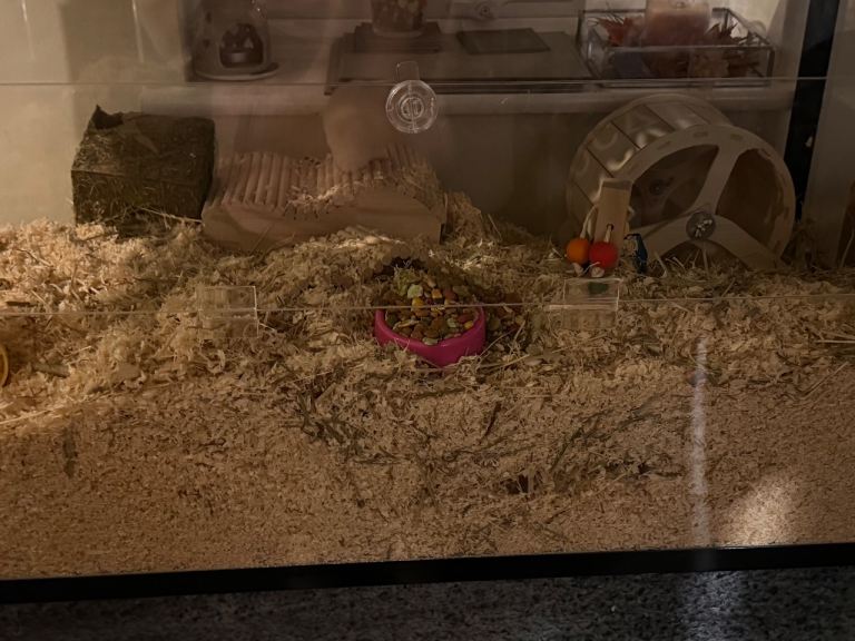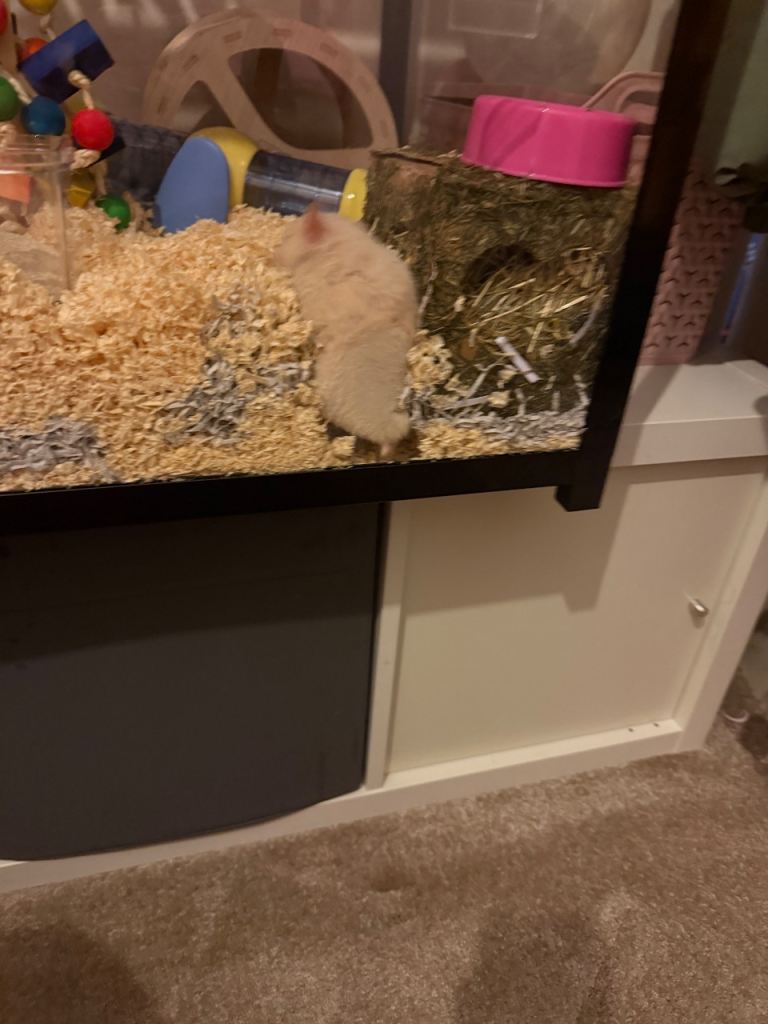 Syrian hamster with Bucastate 3.0 cage. Brilliant cage set up, can have really deep sawdust for burrowing. No bars to avoid bar biting. Really friendly hamster used to been handled, but unfortunately my kids just don’t bother now due to longer days & busy weekends.