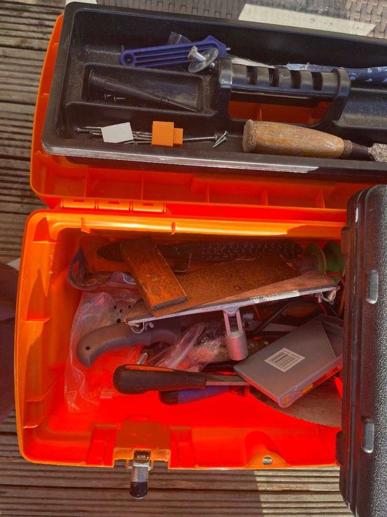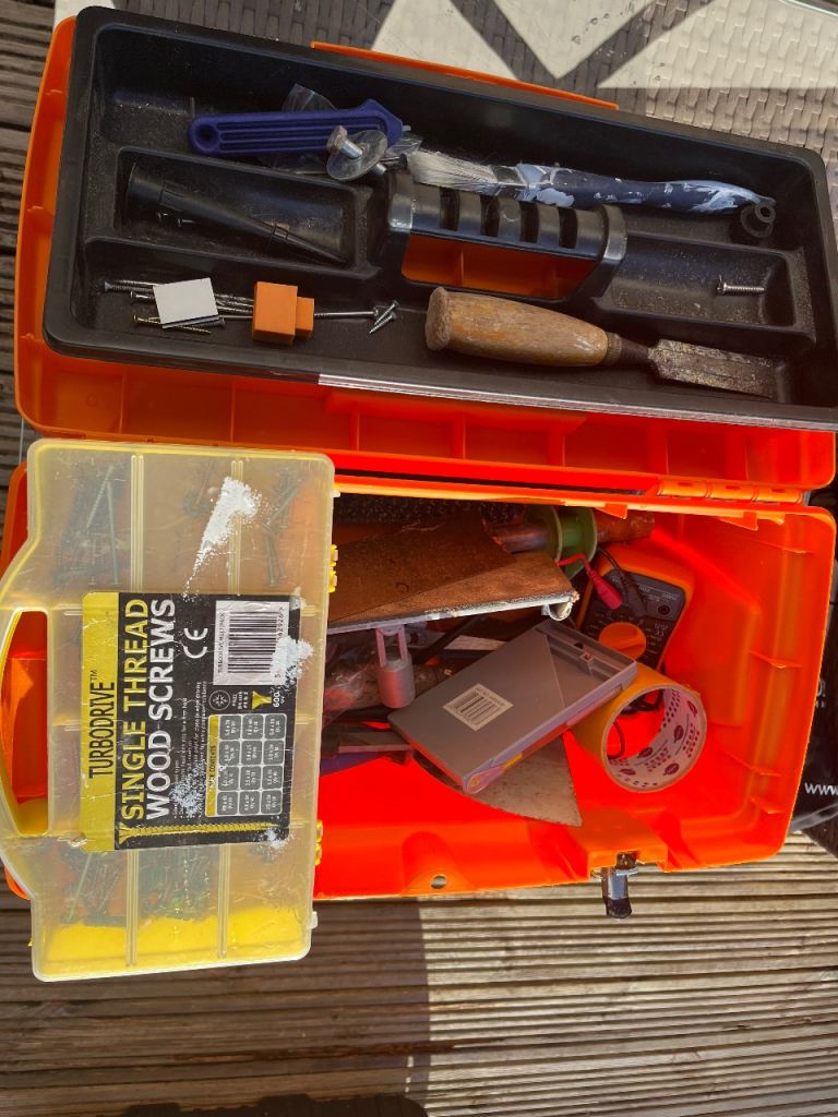 • Orange Plastic Toolbox: Durable storage box containing a wood chisel, wood screw multipack (Turbodrive), tape, and various hand tools.