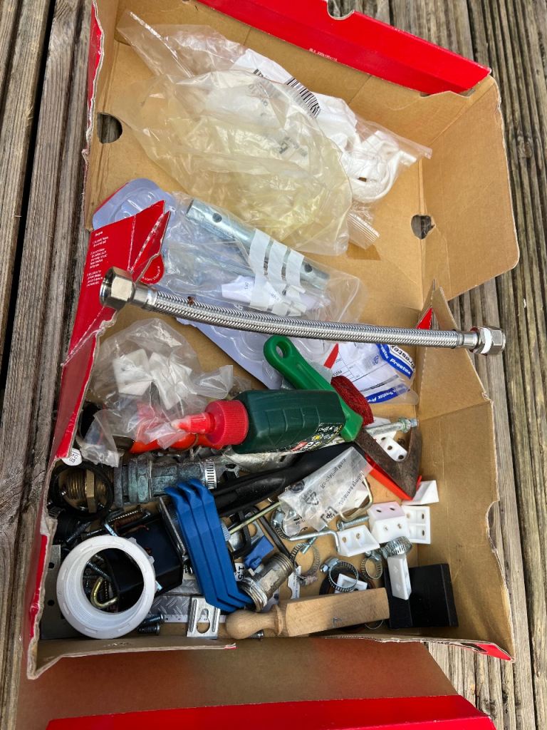 • Hardware & Plumbing Box: Miscellaneous hardware including a flexible braided plumbing hose, hose clips, metal brackets, and various adhesives.