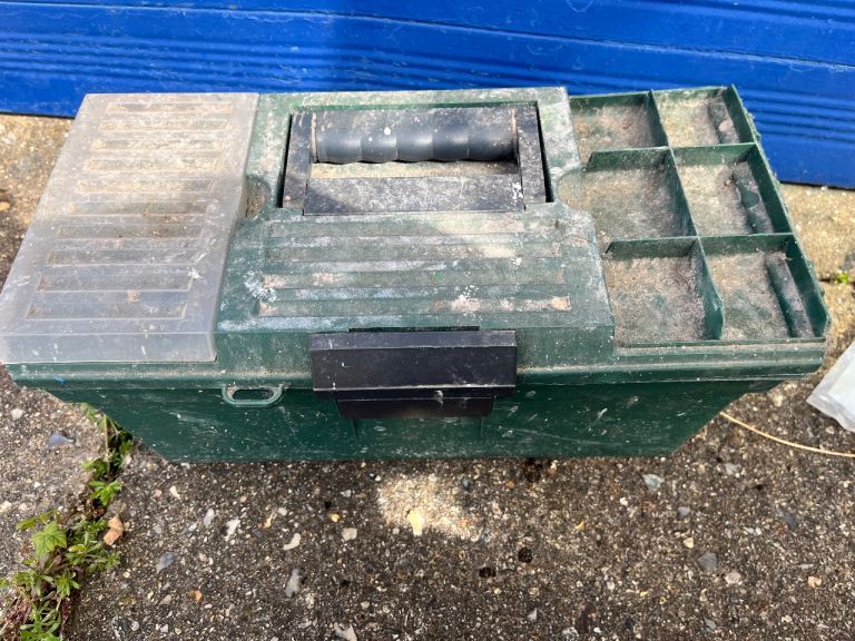 The box itself is sturdy plastic with internal compartments, showing signs of outdoor use and dust.