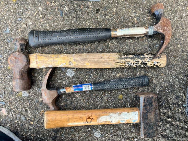The tools are a mixed bag, some with wooden handles, others plastic, all functional but with visible wear and rust.