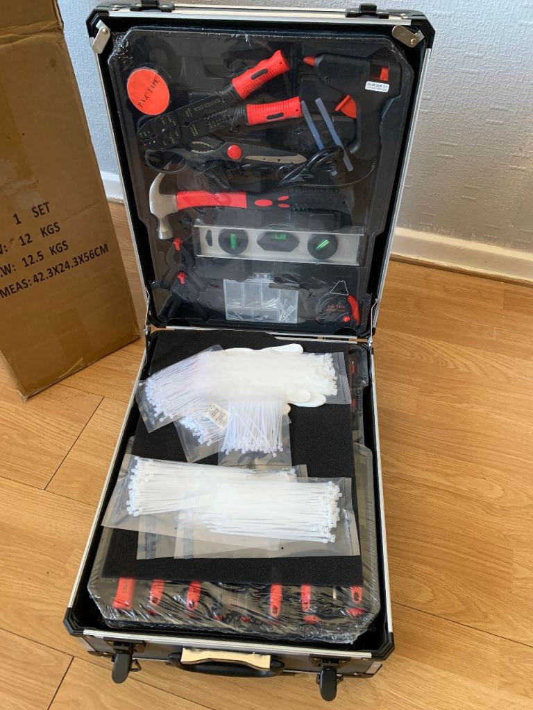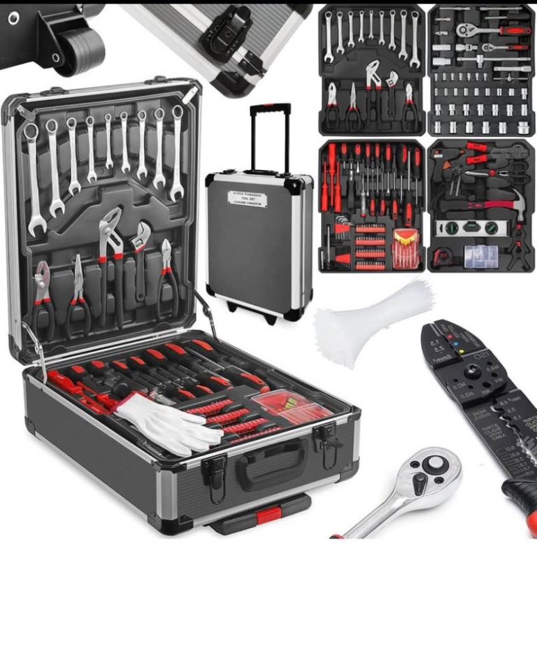Socket Set + Insulation Screwdriver + Rachet Bits + Tester + Hex Key + Extension Bar + Insulation Tape + Wire Stripping Pliers + Glue Stick + Measuring Tape + Aluminum Level + Side Cutting Plier + Wrench + Much More