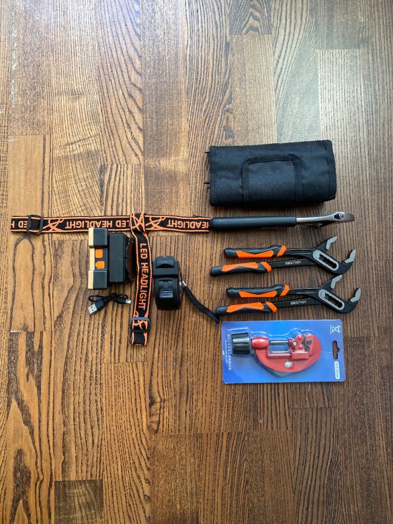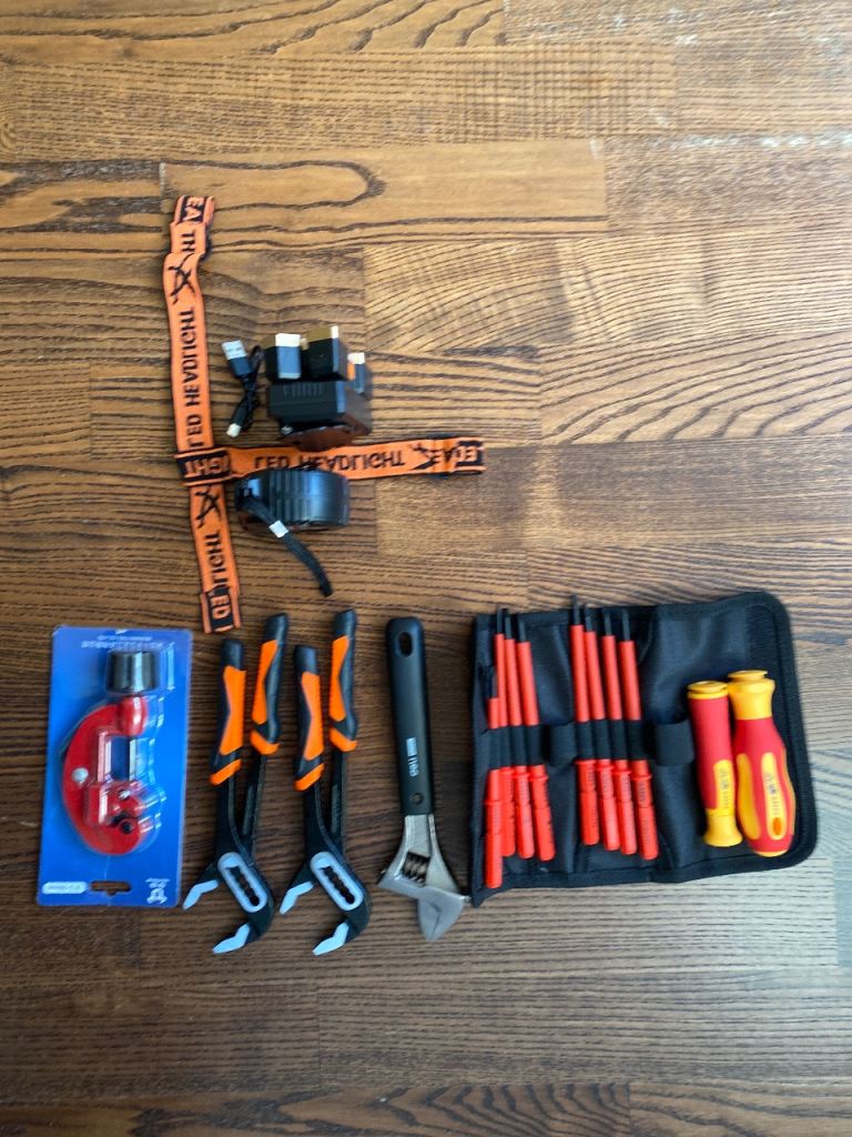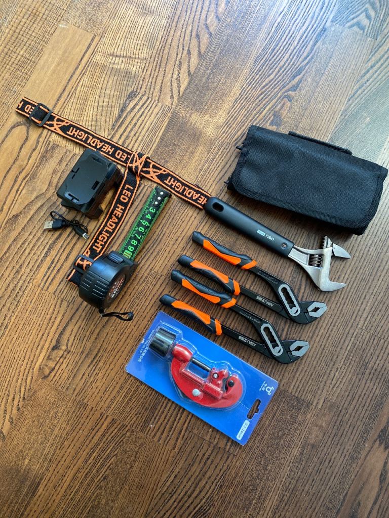 Includes insulated screwdriver set with pouch, adjustable wrench, water pump pliers (2 pcs), pipe cutter, tape measure and USB rechargeable LED headlamp.