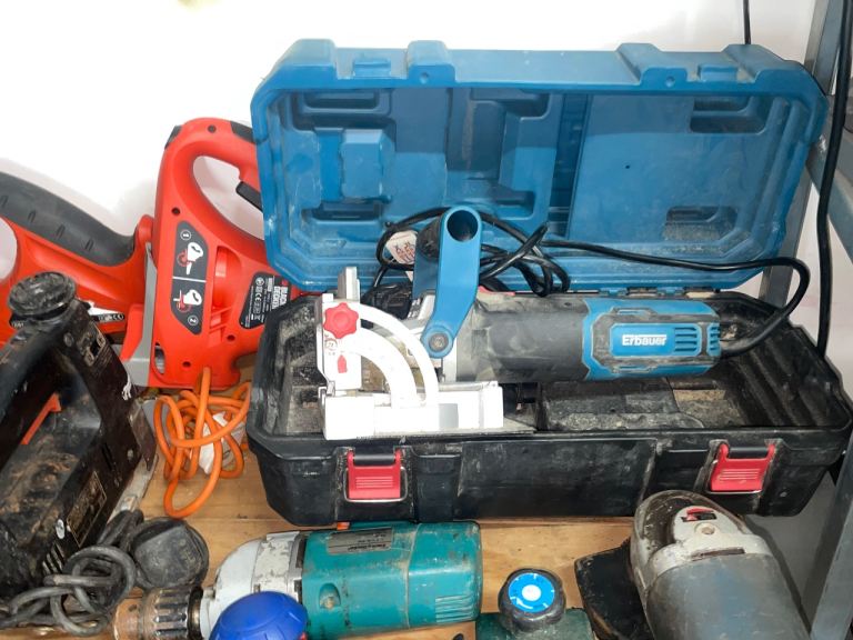 Drills, heat gun, Sanders, saws, Biscuit jointer , grinder