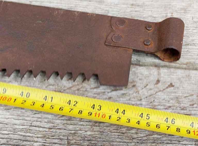 This vintage two person saw measures about 46" (117cm) in length and has one wooden peg handle.