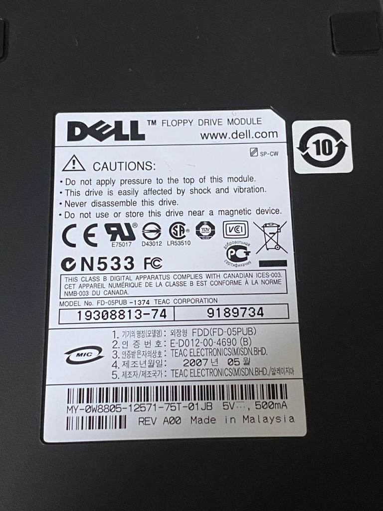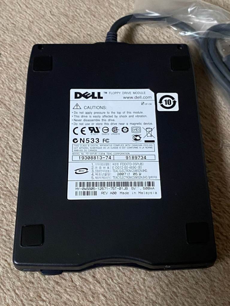 Dell USB External Floppy Disk Drive, FD-05PUB, manufactured by TEAC Corporation.