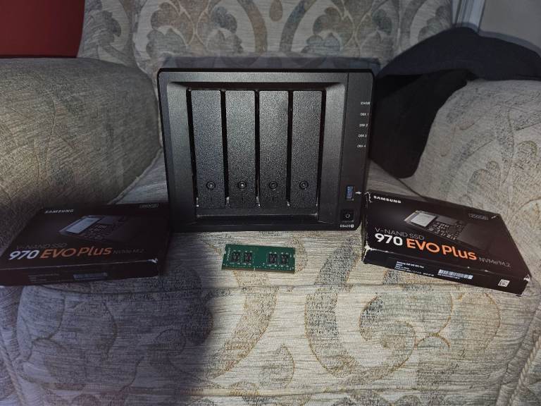 Comes with 2 samsung evo 970 plus 250gb nvme drives for cache & crucial memory upgrade 4gb so has 6gb now. all reset to factory settings. all boxed & in excellent condition, The Synology DiskStation DS420+ is a 4-bay NAS unit designed for use with PCs. It features USB 3.0 connectivity and a sleek black design. With support for HDD and SSD storage formats, this NAS is perfect for storing and accessing your data efficiently. The Synology DS420+ model offers reliable performance and a user-friendly interface, making it an ideal choice for personal or business storage needs. selling as Ive upgraded to a larger system. latest DSM installed just needs you hdd's installed. Can be seen working.