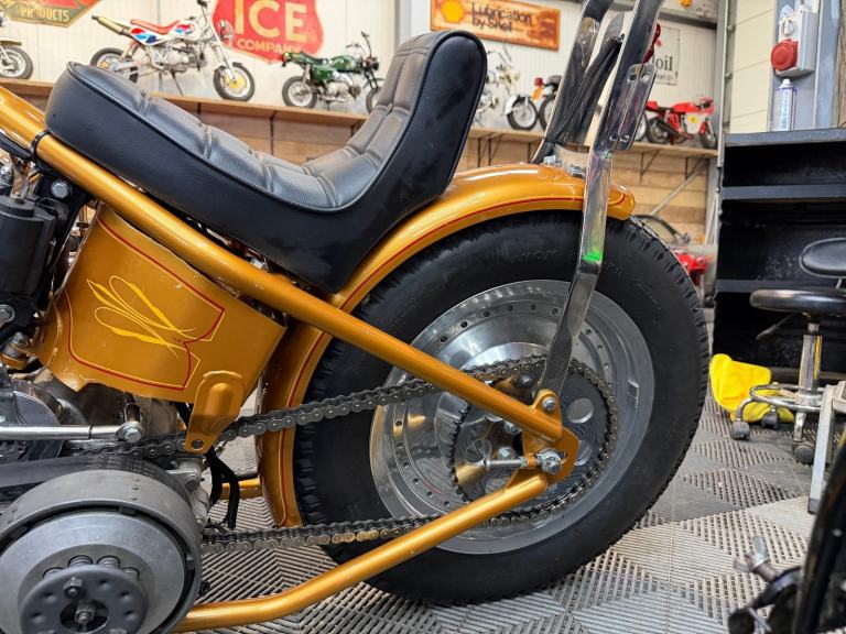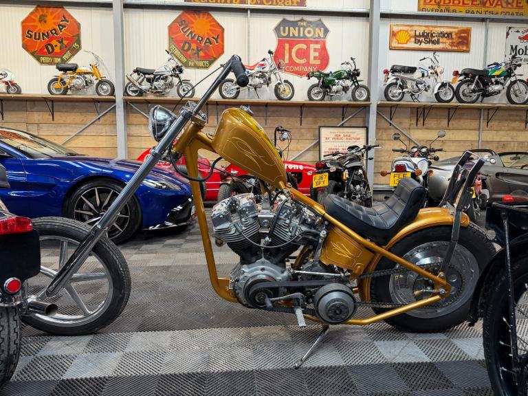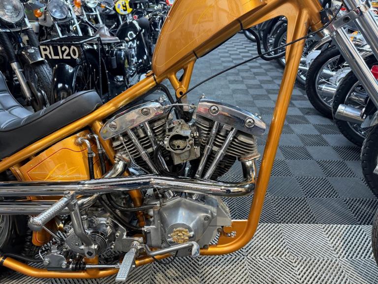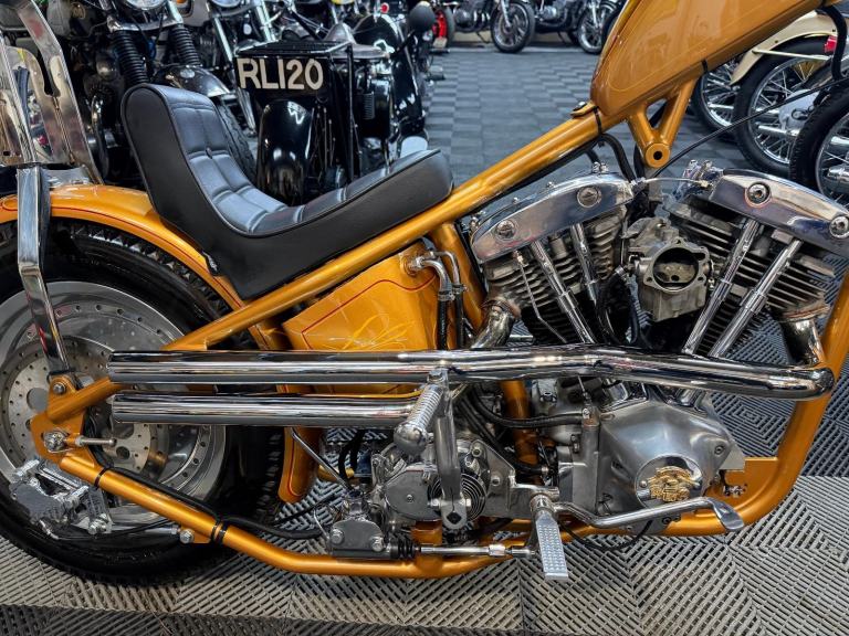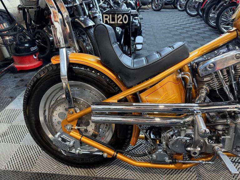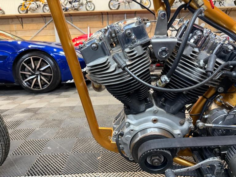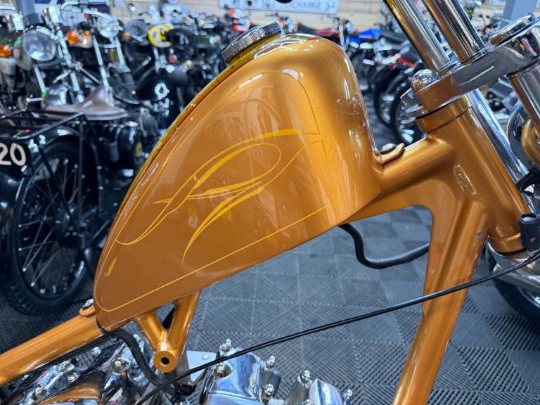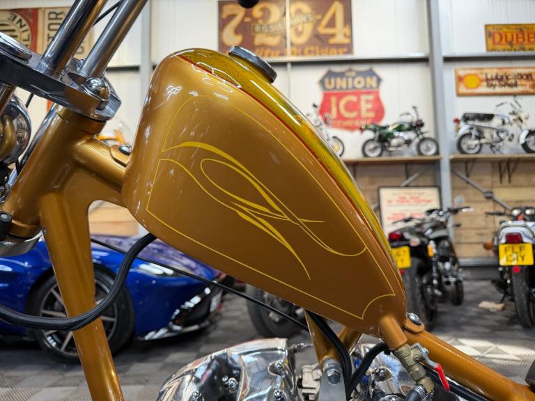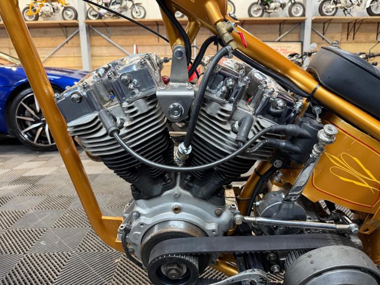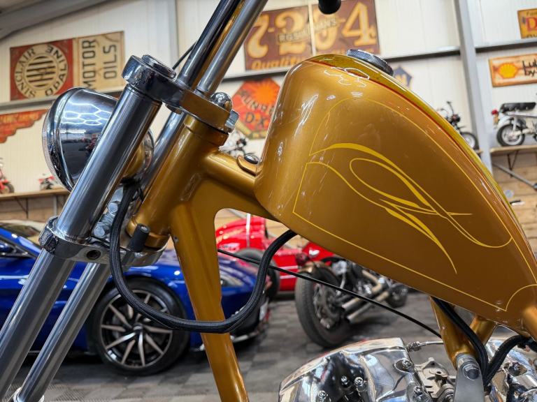 kick start only and fires off the 2/3rd kick and runs sweet as a nut, the frame is a custom single down tube frame made by Heman Fabrication a very reputable fabrication company in the states, fitted with 8”over stock front forks in excellent condition and custom made bars and a harley davidson rocker C front wheel with new avon tyre. Rear wheel fitted is a custom solid face wheel from ricks motorcycles with a like new avon speed master tyre which are becoming very rare now, custom shot gun exhaust pipes in chrome excellent sound and condition, prisim supply electrics kit and rear tail lamp,brand new yuasa battery, and new headlamp, open primary conversion with recent drive belt, custom sissy bar. painted in gold with custom tank art, and pin striping. Chrome performance machine rear brake caliper in excellent condition.