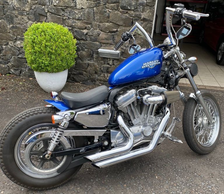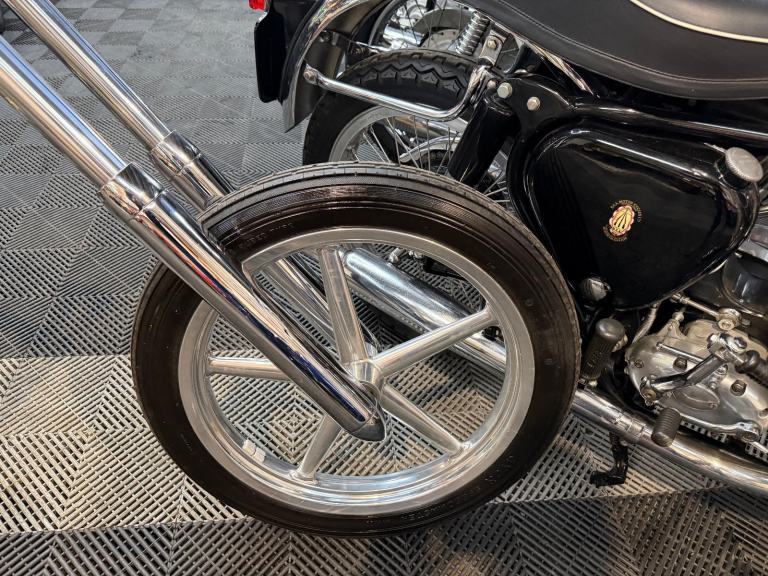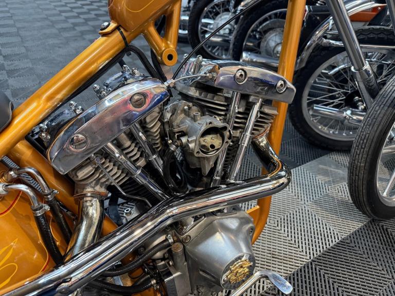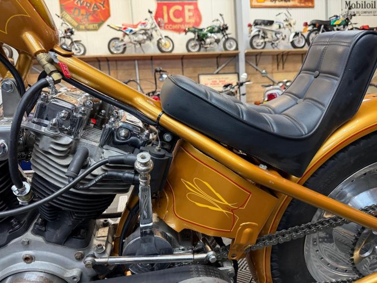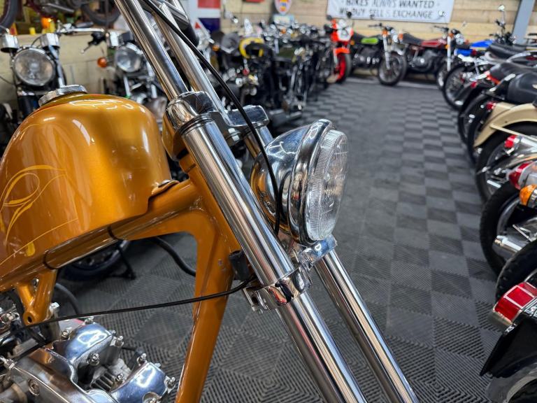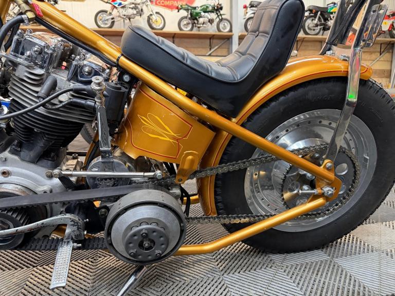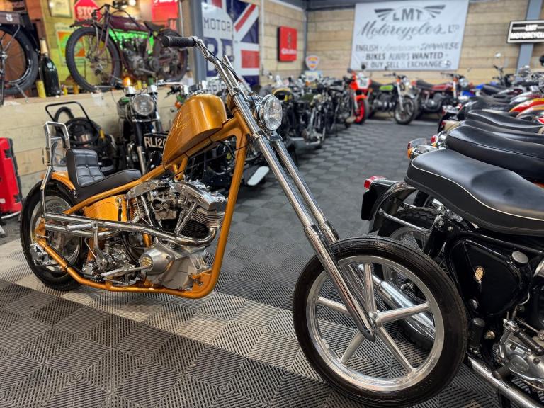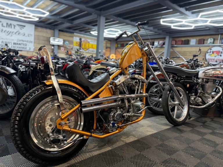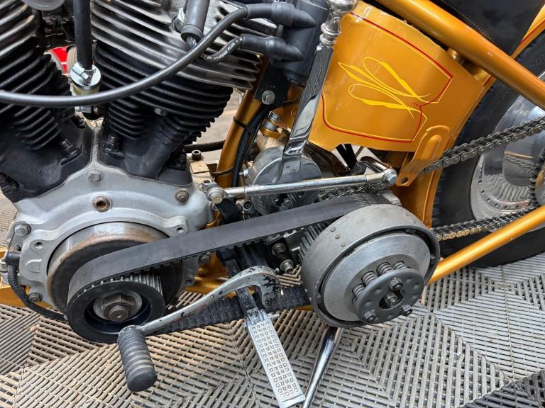 kick start only and fires off the 2/3rd kick and runs sweet as a nut, the frame is a custom single down tube frame made by Heman Fabrication a very reputable fabrication company in the states, fitted with 8”over stock front forks in excellent condition and custom made bars and a harley davidson rocker C front wheel with new avon tyre. Rear wheel fitted is a custom solid face wheel from ricks motorcycles with a like new avon speed master tyre which are becoming very rare now, custom shot gun exhaust pipes in chrome excellent sound and condition, prisim supply electrics kit and rear tail lamp,brand new yuasa battery, and new headlamp, open primary conversion with recent drive belt, custom sissy bar. painted in gold with custom tank art, and pin striping. Chrome performance machine rear brake caliper in excellent condition.
