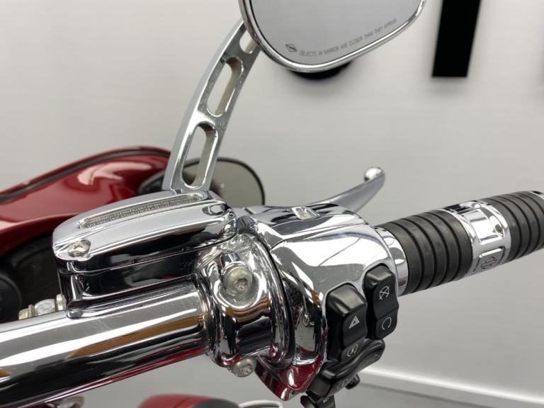 Chrome passing lights with chrome visors, Chrome highway pegs, Chrome fused ape handlebars, Chrome diamondback cables, Chrome switch housing & controls, Chrome Kahuna grips, Chrome billet mirrors, Vance & Hines carbon air filter, Chrome Vance & Hines duals with chrome slip ons with carbon end caps, Colour matched detachable tour pack and chrome luggage rack.
