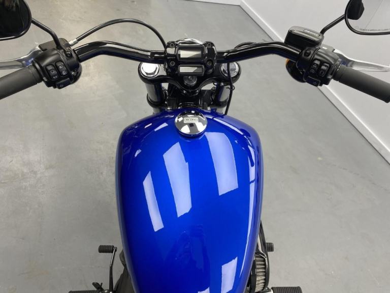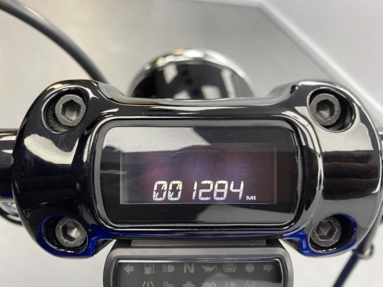 This stunning blue Street Bob comes to us fitted with a set of black lower 1 1/4 inch handlebars and risers completely transforming the look and comfrot of the bike. The bike has had one previous owner, is in fantastic condition and has covered just 1,284 miles.