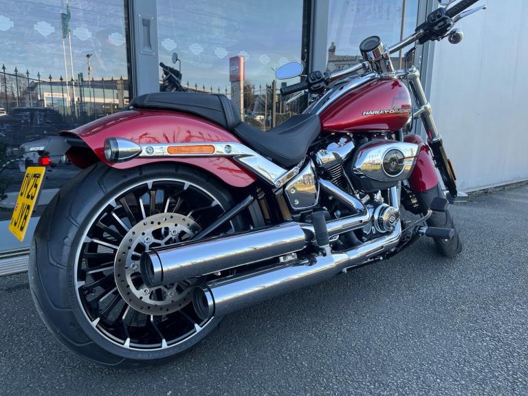 The 2025 Harley-Davidson Breakout 117 isn’t just a motorcycle; it’s a statement of pure Milwaukee muscle. Built with a long, raked-out silhouette and dripping in premium chrome, this factory custom is designed to dominate the street and command every eye in the room.Performance That BitesAt its heart beats the Milwaukee-Eight 117 Custom V-Twin—Harley’s pinnacle of factory-installed torque and displacement.Massive Power: Delivers a brutal 126 ft-lb of torque and 104 HP for intense acceleration and effortless highway cruising.High-Flow Intake: Features the high-performance Heavy Breather intake with a forward-facing exposed filter to maximize airflow.Selectable Ride Modes: For 2025, fine-tune your ride with Road, Rain, and Sport modes that adjust throttle response and safety interventions on the fly.Aggressive Custom StyleThe Stance: A signature 240mm rear tire and a tall 21-inch, 26-spoke cast aluminium front wheel plant the bike with an unmistakable dragster-inspired profile.Chrome Everything: From the fender supports and side covers to the muffler shields and mirrors, the 117 is designed to shine.The Tank: A beautifully shaped 5-gallon (18.9L) fuel tank ensures you spend more time on the road and less at the pump.Cutting-Edge InnovationDon't let the old-school chopper look fool you—the 2025 Breakout is loaded with modern tech:Advanced Rider Safety: Features Cornering Enhanced ABS (C-ABS), Traction Control (C-TCS), and Tire Pressure Monitoring (TPMS).Modern Lighting: A new all-LED lighting package includes a bright 146mm headlamp and integrated rear turn signals.Stay Connected: Integrated USB-C fast charging keeps your devices powered for long-distance hauls.