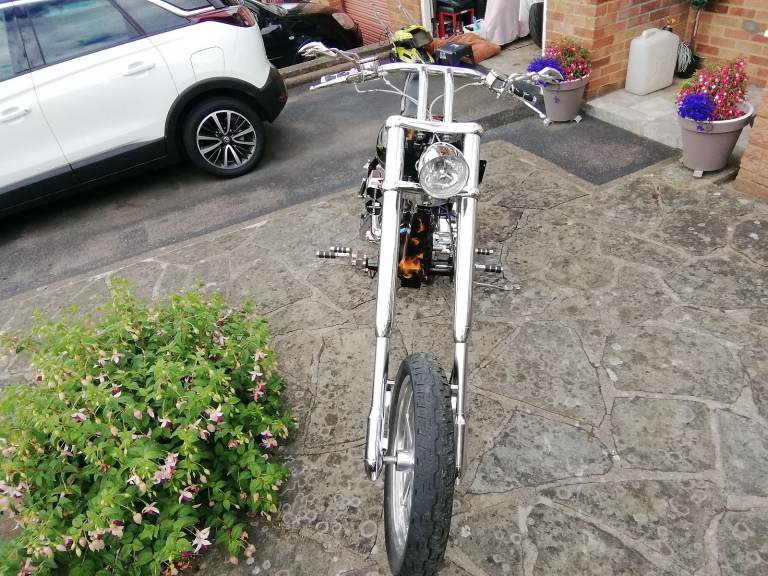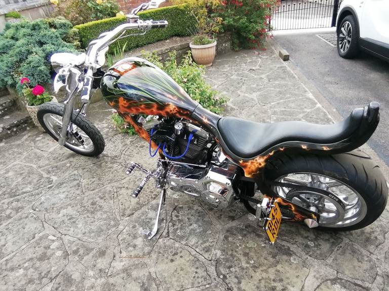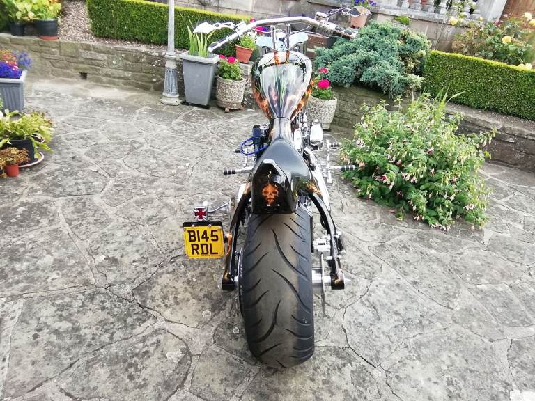 1340 Evo engine, single Fire ignition, Rocker C wheels, Hard tail frame, but keep the fat rear low psi, and surprisingly not as hard a ride as you would think.... Minimalistic controls, as per pics so no indicators, or crap to fill the bars... As you can see unique one off everything..