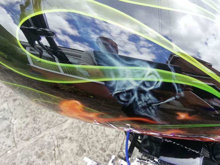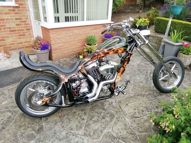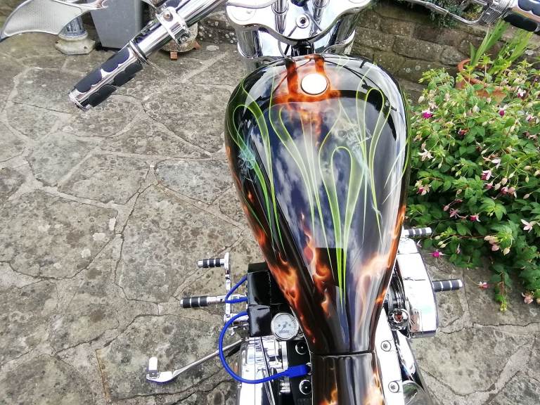 Harley Davidson Chopper. One off Frame custom built by No Nonsense Chops Scotland, unique paint by Muddy Beach Custom paintwork.