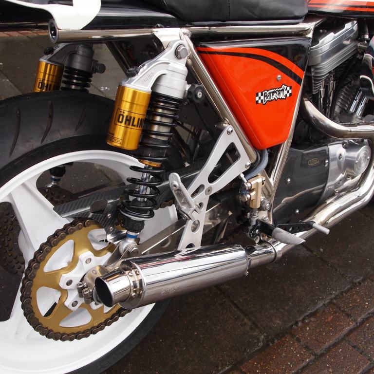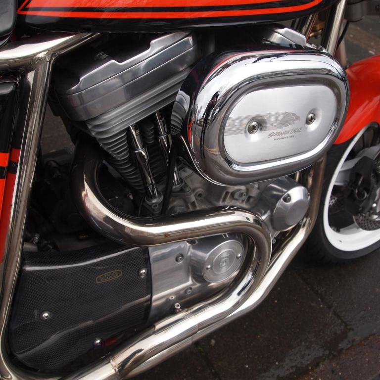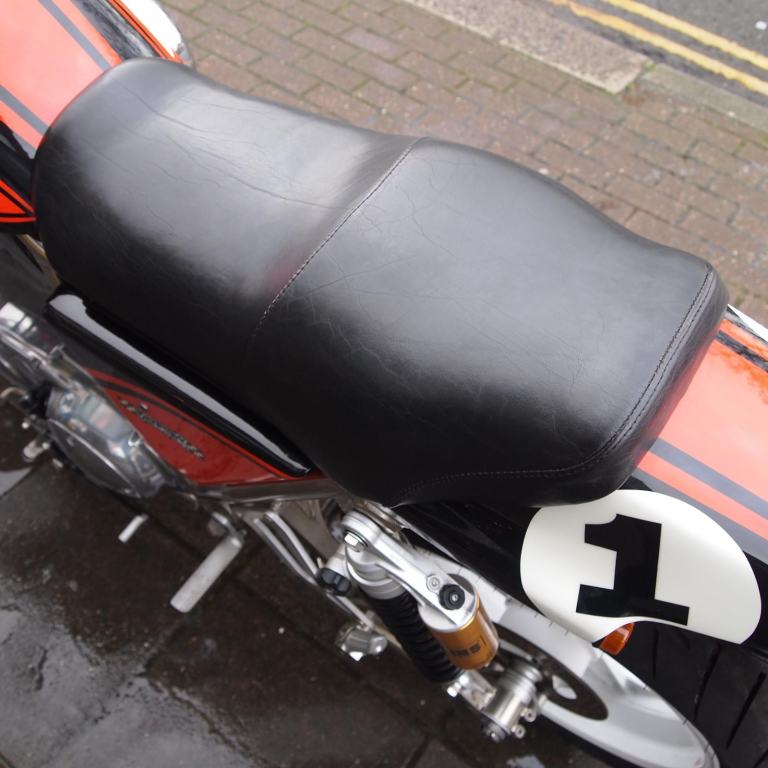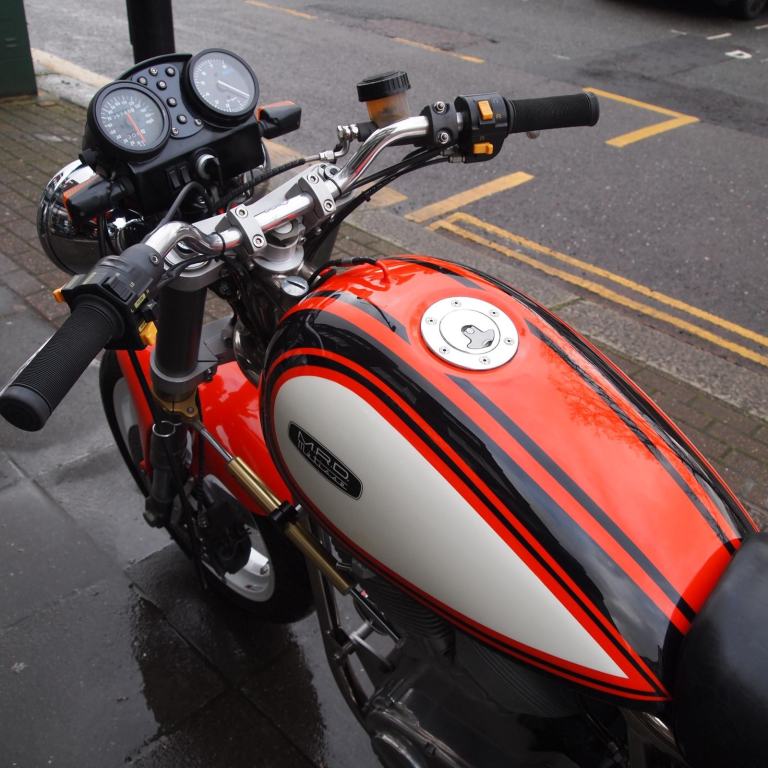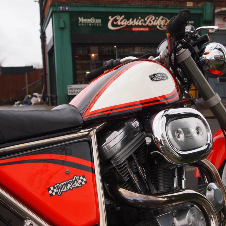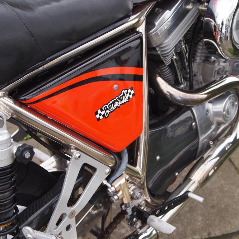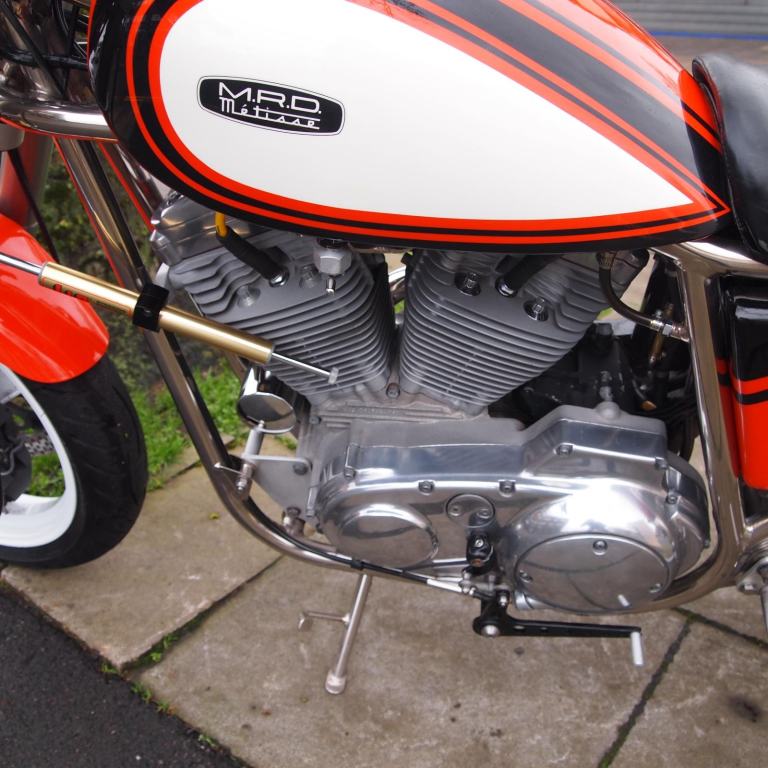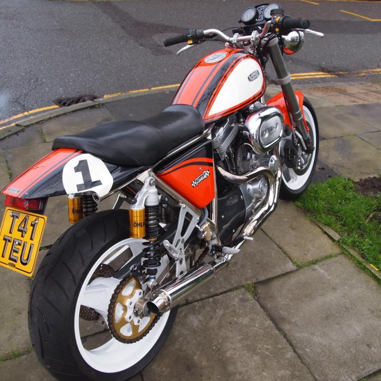 Built by Pat French and Mark Jannink of MRD Metisse in Bristol, 'T41 TEU' was registered as a Metisse with a year-related registration number in 1999. Based around the MRD nickel-plated chrome moly oil-bearing frame and swingarm, this example has benefited from the very best components in the build. The 1198cc Sportster Evo engine was converted to chain drive with mild tuning for reliability. Spondon engineering provided the 54mm White Power Roma fork legs along with the adjustable yokes. Spondon also provided the 4 pot front brake callipers and brackets and the 320mm brake discs. The wheels are Dymag Classic H Section with cush drive. There's a WP 5140 Steering damper, carbon fibre tail unit and side panels, engine sprocket cover and chain guide, alloy Pearson petrol tank, Ohlins adjustable rear shock absorbers, headlamps from a Triumph T509, an upholstered leather hide seat, a custom-built exhaust system (very quiet) and an Elliot tachometer and RGV 250 speedometer paired-up perfectly in their custom housing. Paintwork was done by Andy at Ultimate Bike Paint. Owned in the same family since new, the bike handles very well with quick but stable handling. It draws a crowd wherever it is parked! The Metisse Harley has now been serviced with a new MOT