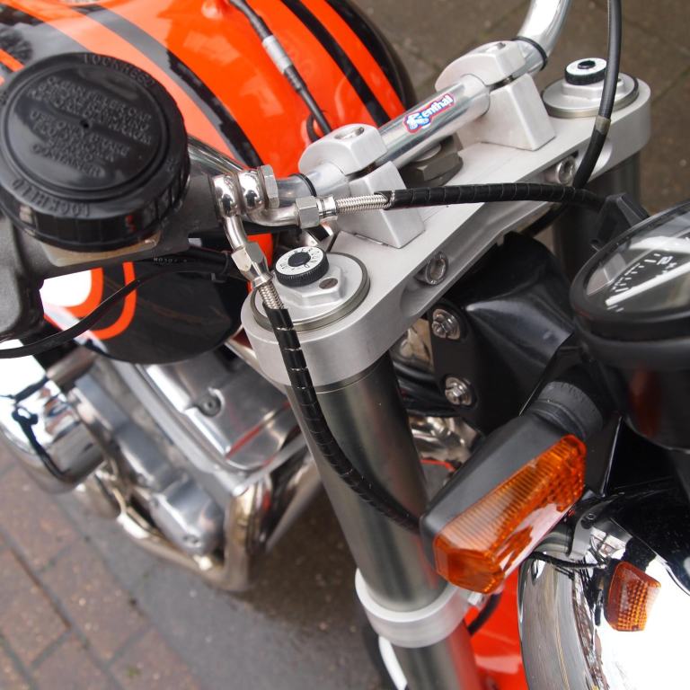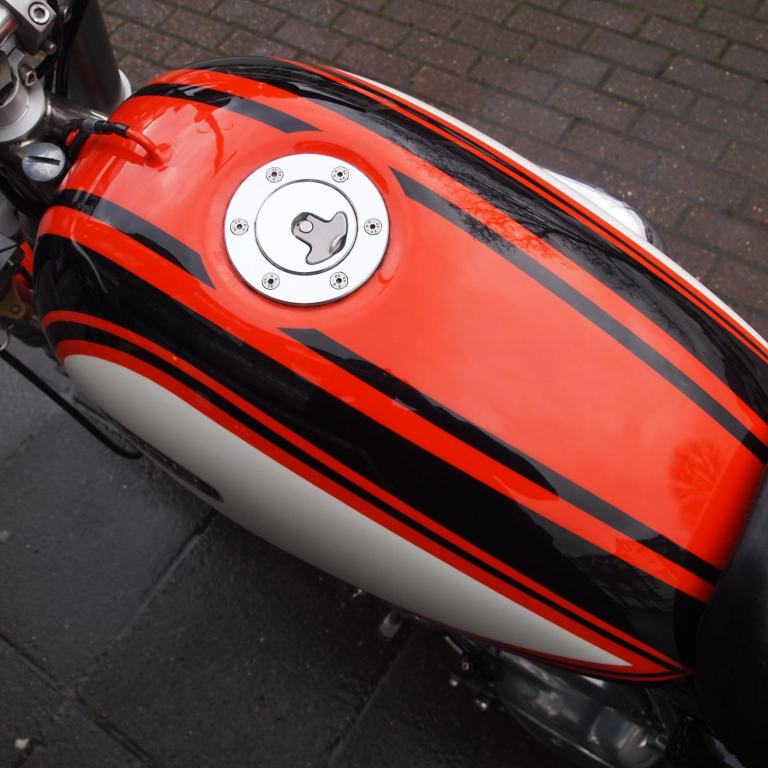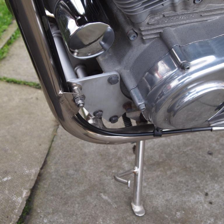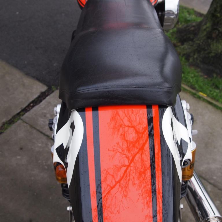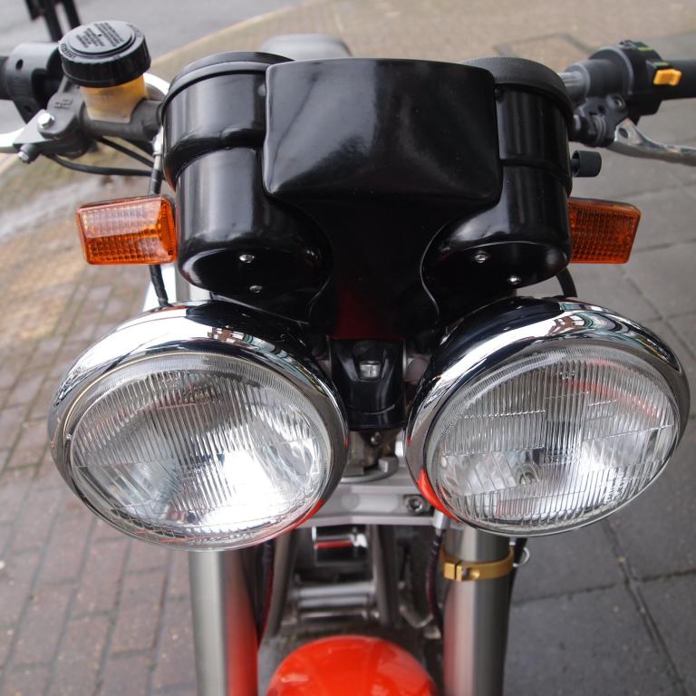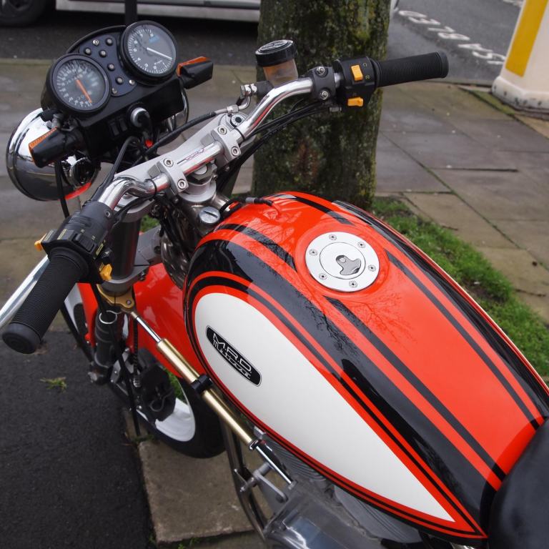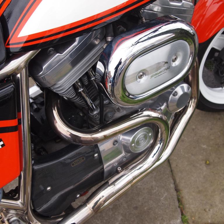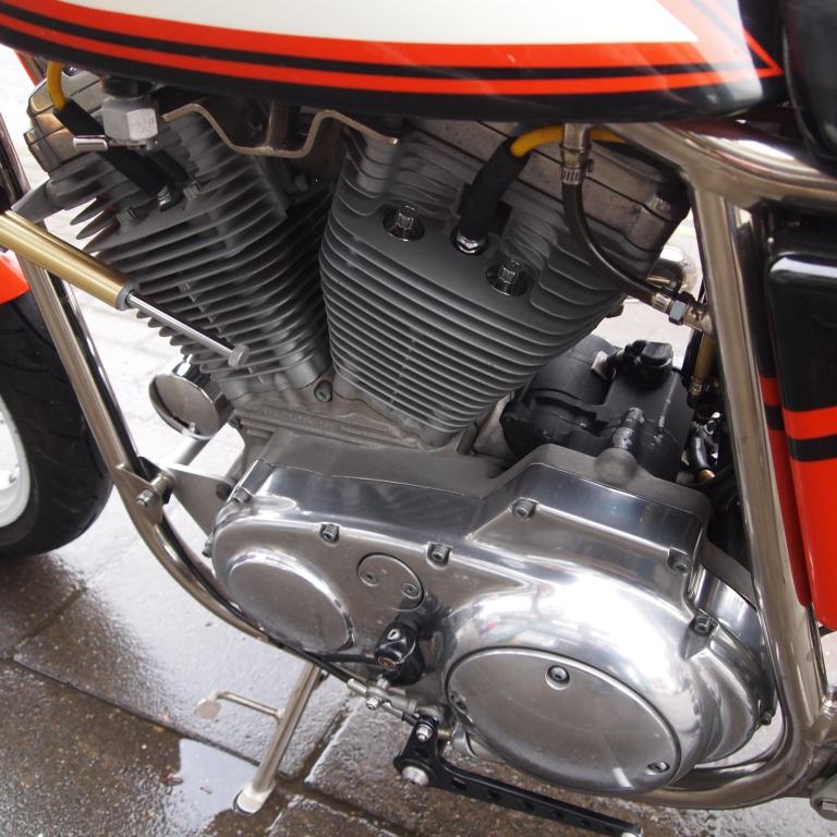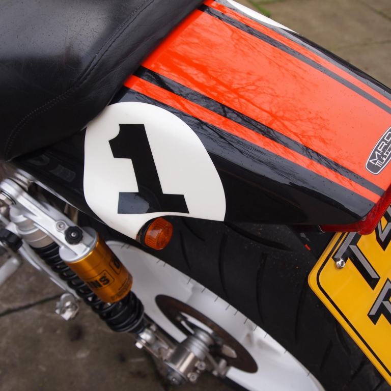 Built by Pat French and Mark Jannink of MRD Metisse in Bristol, 'T41 TEU' was registered as a Metisse with a year-related registration number in 1999. Based around the MRD nickel-plated chrome moly oil-bearing frame and swingarm, this example has benefited from the very best components in the build. The 1198cc Sportster Evo engine was converted to chain drive with mild tuning for reliability. Spondon engineering provided the 54mm White Power Roma fork legs along with the adjustable yokes. Spondon also provided the 4 pot front brake callipers and brackets and the 320mm brake discs. The wheels are Dymag Classic H Section with cush drive. There's a WP 5140 Steering damper, carbon fibre tail unit and side panels, engine sprocket cover and chain guide, alloy Pearson petrol tank, Ohlins adjustable rear shock absorbers, headlamps from a Triumph T509, an upholstered leather hide seat, a custom-built exhaust system (very quiet) and an Elliot tachometer and RGV 250 speedometer paired-up perfectly in their custom housing. Paintwork was done by Andy at Ultimate Bike Paint. Owned in the same family since new, the bike handles very well with quick but stable handling. It draws a crowd wherever it is parked! The Metisse Harley has now been serviced with a new MOT