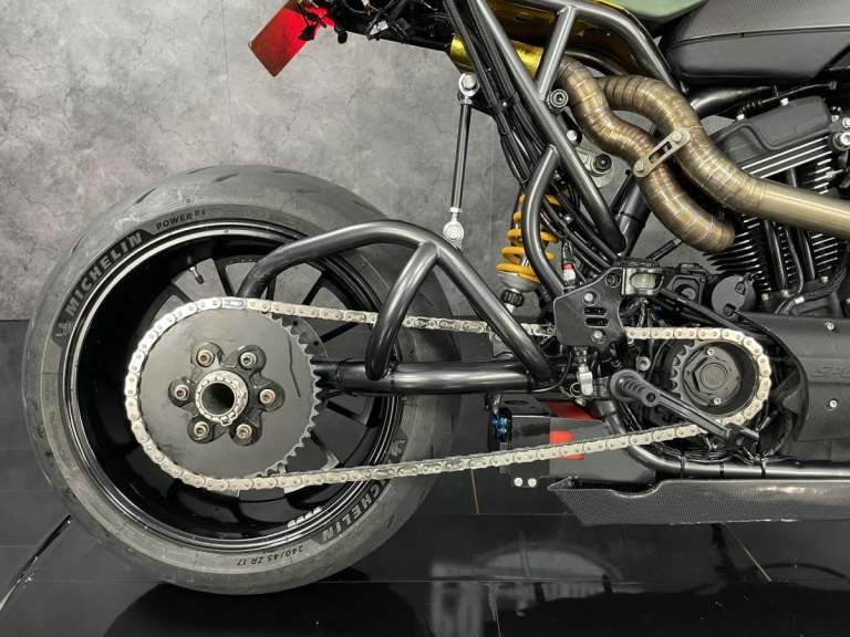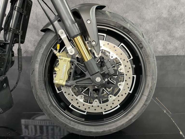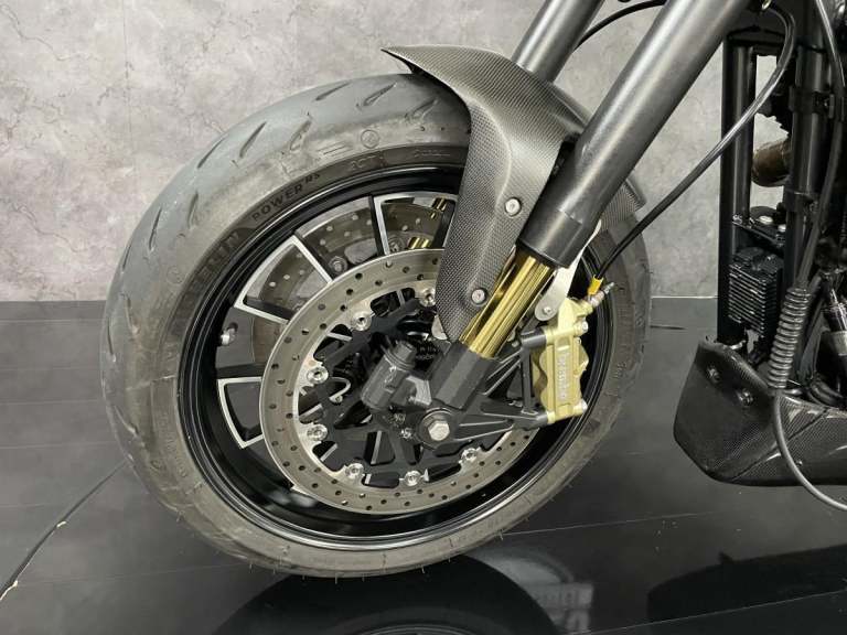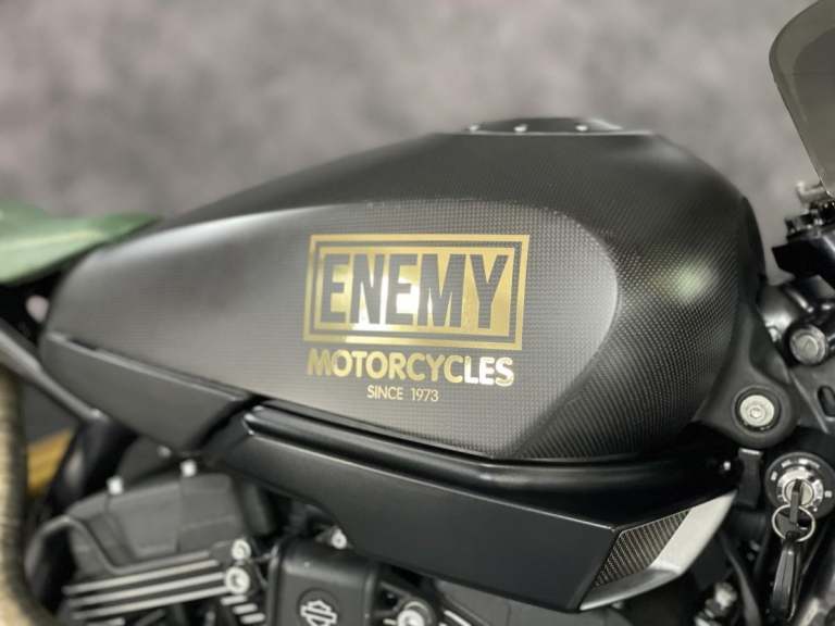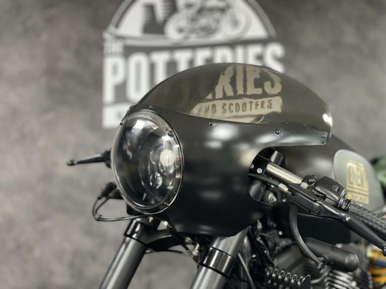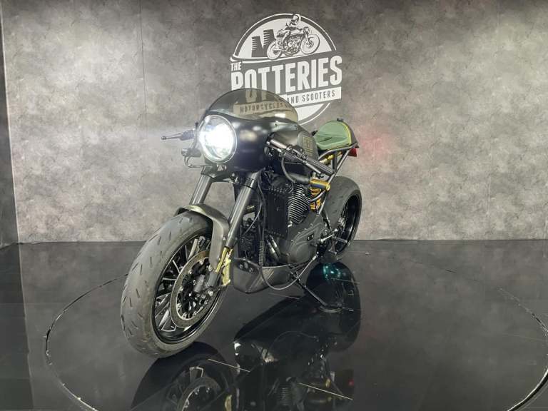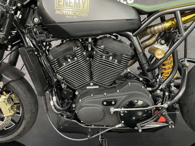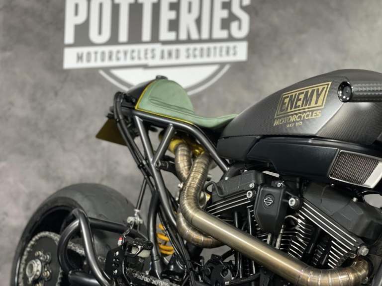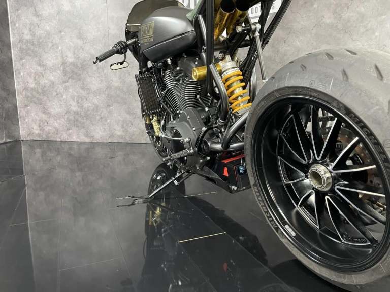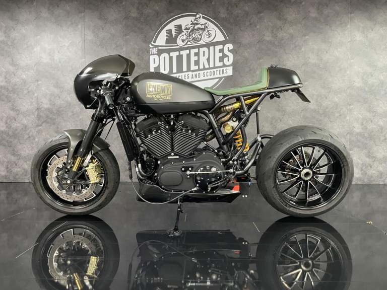 Harley Davidson XR1200 X Sportster 1 of 1 custom Cafe Racer formally owned by the main man behind Public Enemy Customs. Known for their extreme builds with custom design and the best components you can get. This personal bike is no exception. Owner for over 6 years this bike started life as a Harley Davidson XR1200X now has a single sided swing arm by RBK, Ducati Diavel 240 rear section wheel tyre, Ohlins Aprilia Factory front forks in the custom triple clamps (£2500) and brembo M4 calipers with double disc set up front and rear. The Motor is over 100hp with custom dual exit exhaust. Carbon tank and custom rear seat pod with oil tank finish the amazing look.