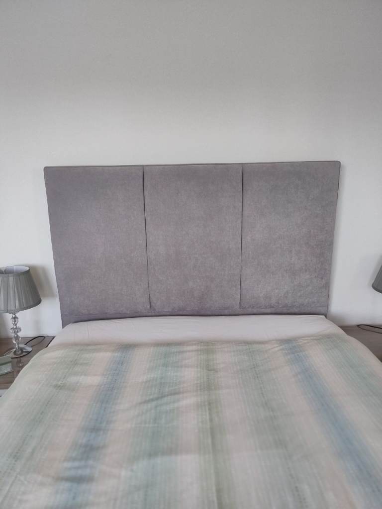 Immaculate floor standing double headboard. Used in spare room only and has had little use. 3 padded panels. Silver grey velour material. 54 ins high/137 CMS