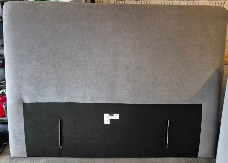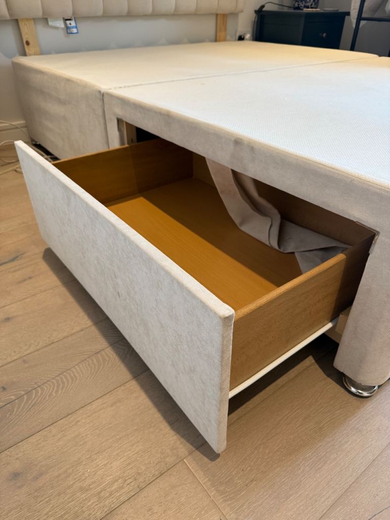 Light grey colour headboard which is detachable. Divan bed base in two blocks which have a drawer on either side for storage.