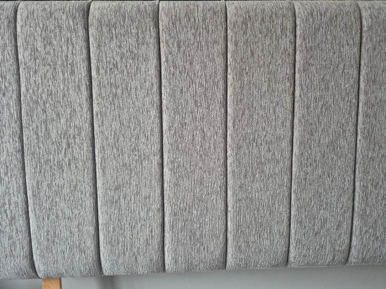 Doublebed headboard, includes fittings. Grey material, very good condition, no marks to tears.