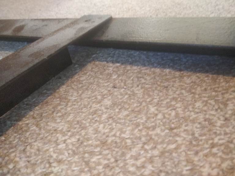 Ornate head and foot board with iron frame. Some surface rust on frame. Headboard has minor damage to the top sculpture and a bubble in the veneer on the bottom rear. Requires new base boards.
