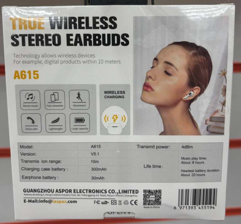 The Aspor A615 True Wireless Stereo Earbuds offer a simple and reliable wireless audio solution for everyday use. Equipped with Bluetooth 5.1 technology, these earbuds provide a stable connection within a range of up to 10 meters, making them suitable for music, calls, and daily activities.