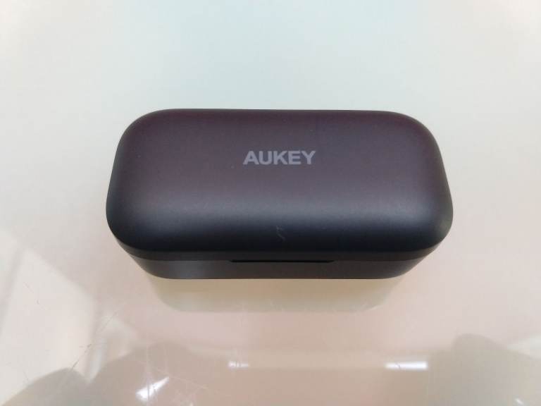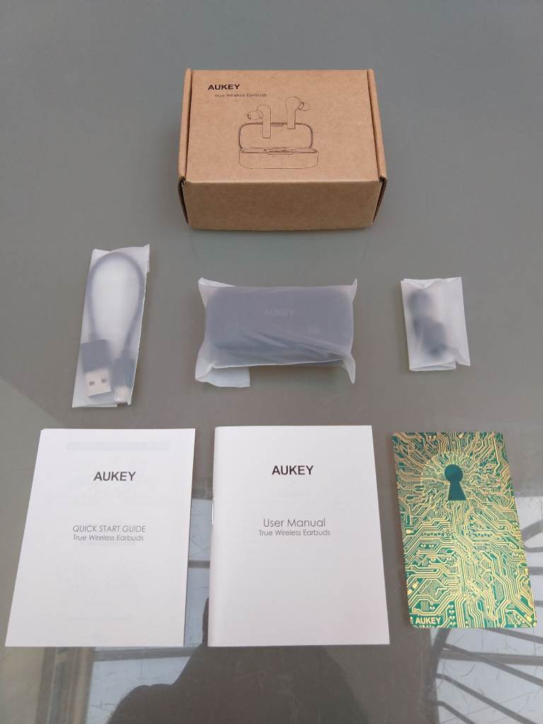 Aukey EP-T21 bluetooth earphones with charging case, USB cable, and 3 pairs of ear tips (S, M, L).