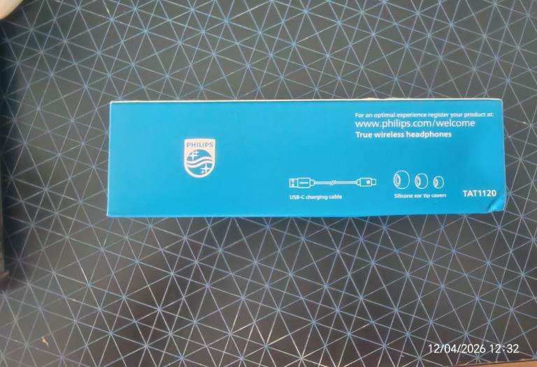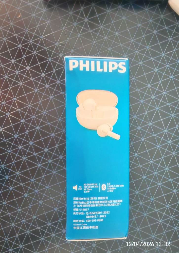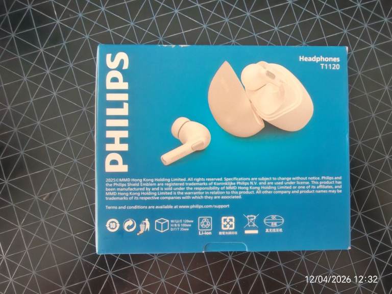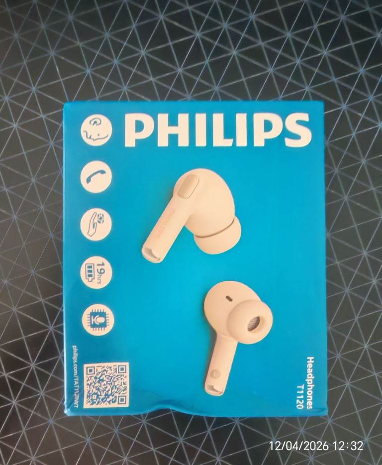 Philips T1120 True Wireless Bluetooth Earbuds, White. The box includes the earbuds and charging case. The earbuds feature a simple design, and the charging case is compact and portable. The earbuds have call functionality and support touch controls. Both the earbuds and charging case are white. 🔹Battery Life: Up to 19 hours on a single charge.