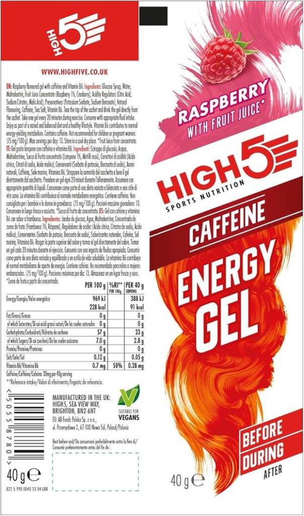 • HIGH-5 Energy Nutrition Gel, Caffeine & Raspberry (40g x 2).