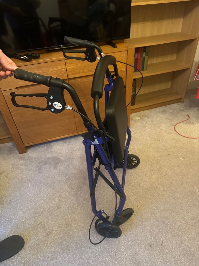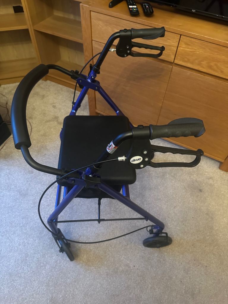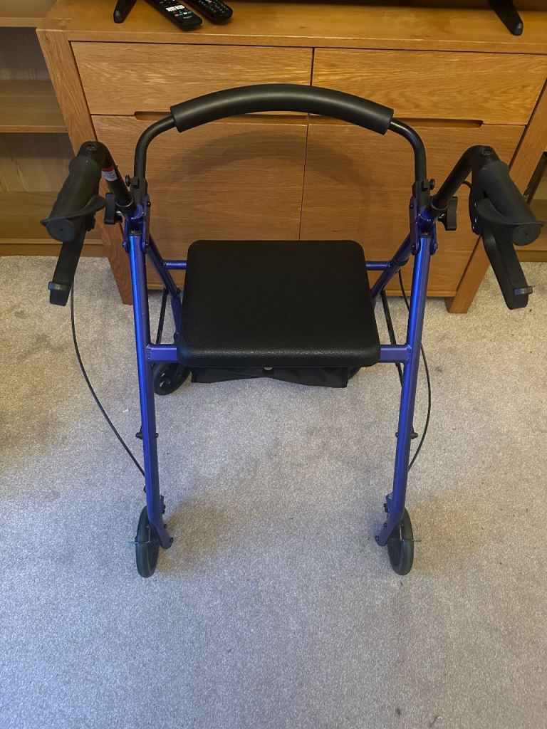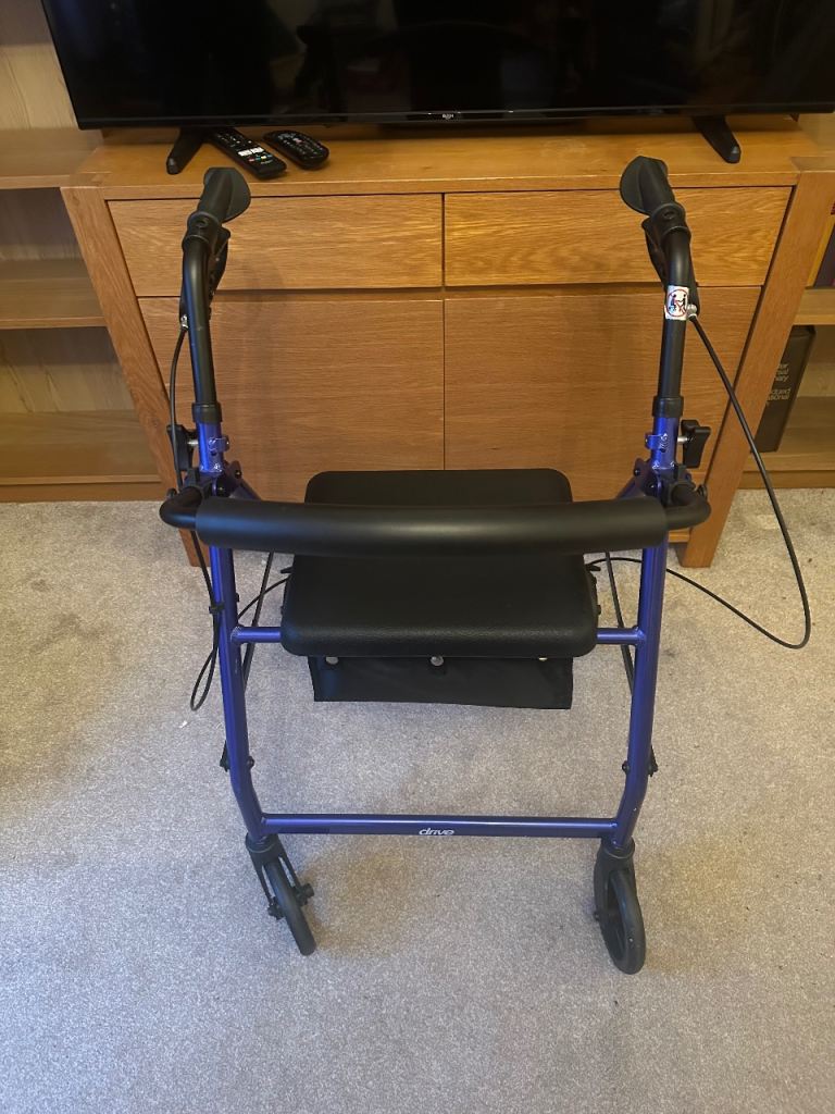 Blue ‘Drive’ four wheeled walker with seat and storage underneath. Has brakes. Excellent condition as barely used.