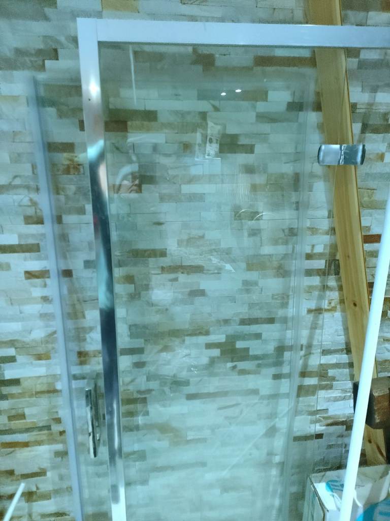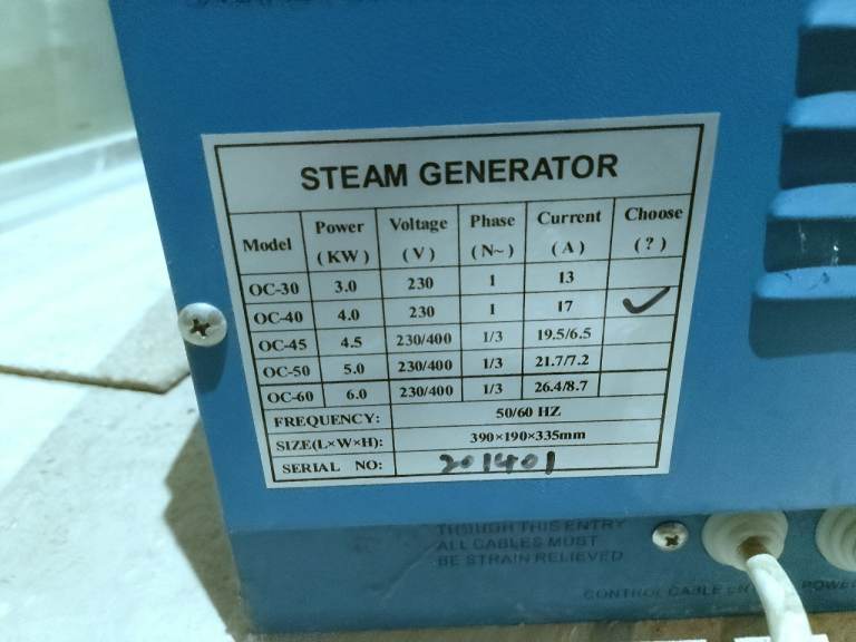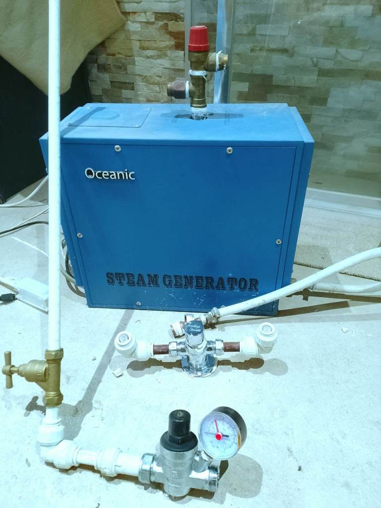 1.2m x 1.2m by 2.08m high steam room With glass door and frame, comes with 4kw steam generator which once connected to mains and water is controlled from inside via the control module.