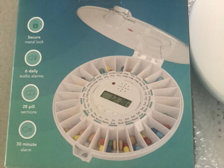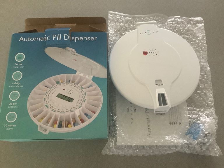 Tabtime Automatic Pill Dispenser. Rotates and dispenses correct medication for each day, also sounds alarm.