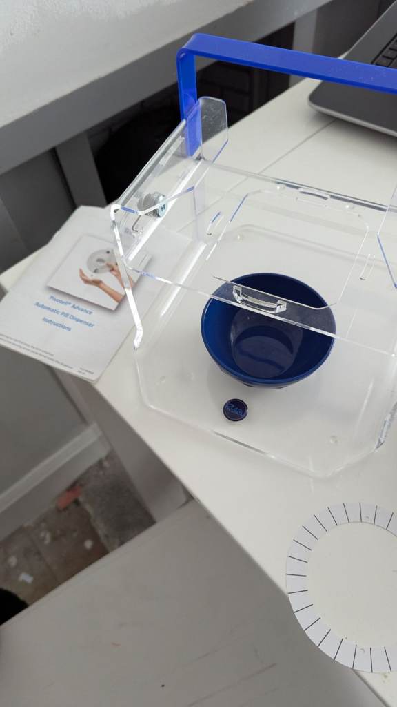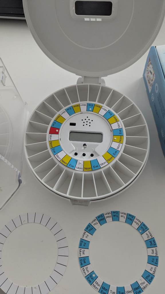Automatic pill dispenser. Used for family member who had dementia and still lived on her own until she moved into a care home. No longer needed as care home gives her the medicines.