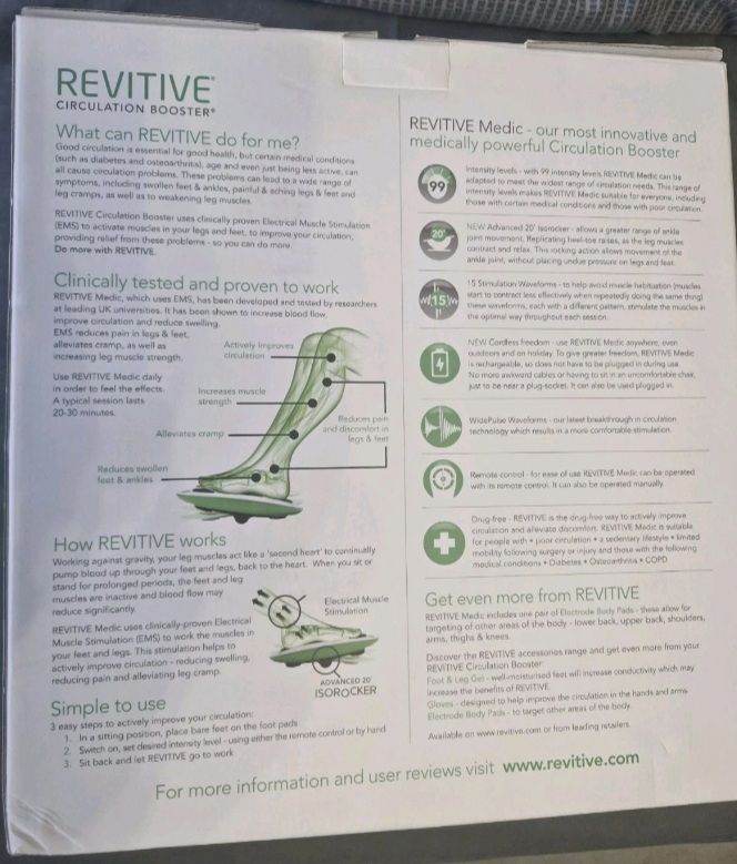 For sale is this Revitive Medic circulation booster. All in perfect working order with no faults or any issues. In nice clean condition and complete in box with charger, remote control and user manual. Was bought new last year and was used only a handful of times. No longer required. Model number is 2469MD.