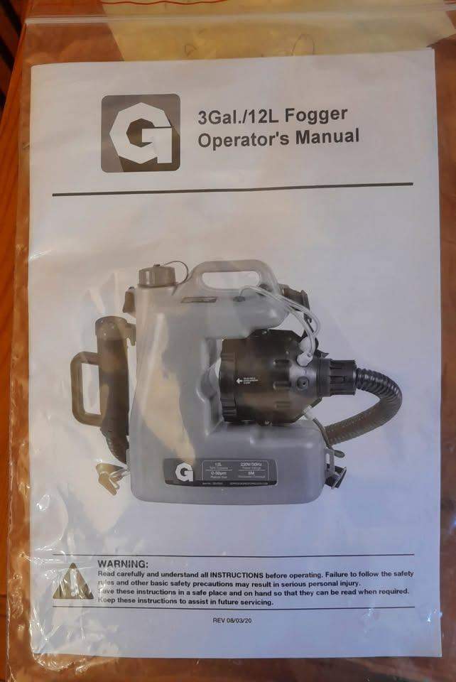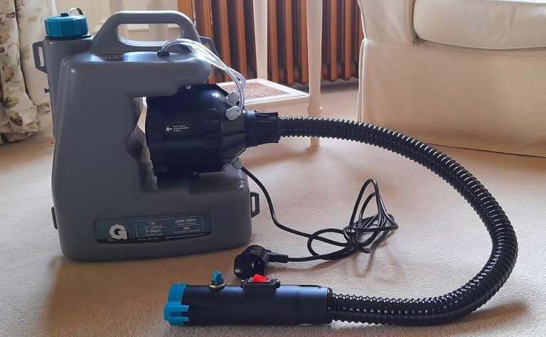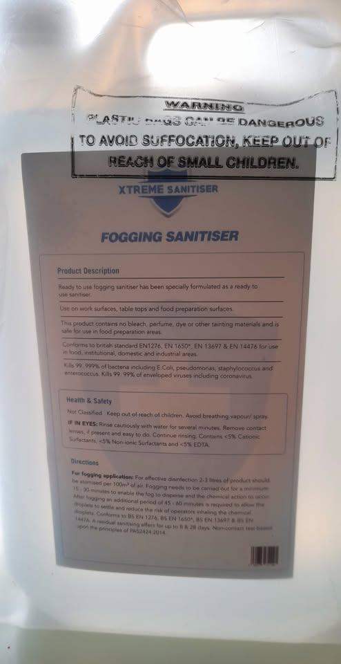 Sanitising Fogger Machine - 12 litre capacity, sale includes backpack carry kit and approximately 8 Litres of Antiviral Sanitising Solution. (Please note the 5 litre V2 Antiviral Disinfectant bottle has been opened, but is still approx 3/4 full. The other 5 litre bottle is unopened and full.) Ideal for sanitising Self-Catering Holiday Accommodation, Guest House or B&B or vehicles. Sanitises rooms in a few minutes. The machine has only been used a few times, selling due to retirement.