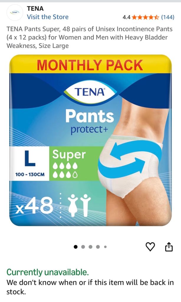 I am selling 4 packs of TENA Pants Super (Unisex elasticated Incontinence Pads) for £40 each so £40 x 4 packs or £160 for almost 200 pads. These are Size Large (100–130cm) with Super absorbency.