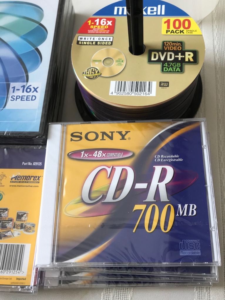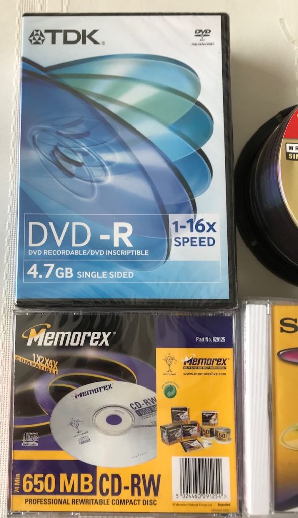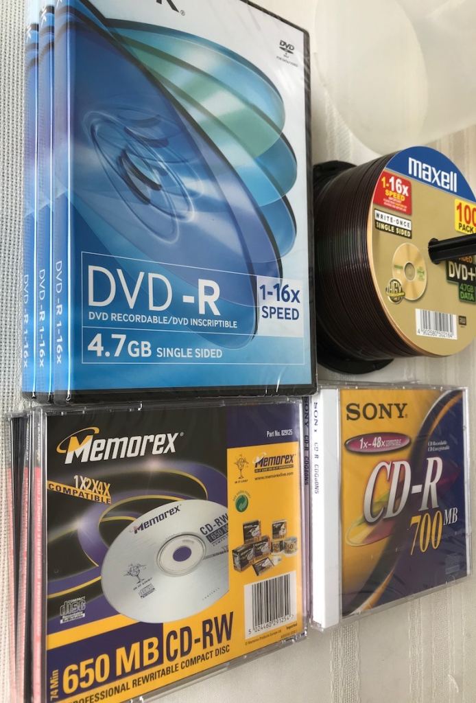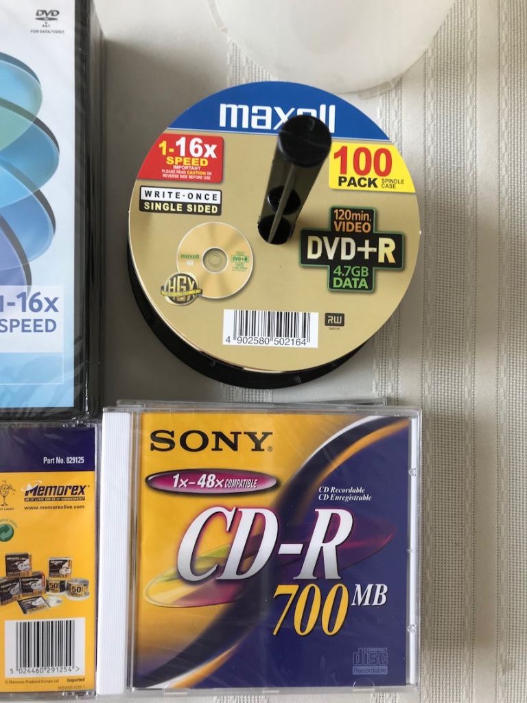 A selection of blank unused CDR-Recordable and DVD-Recordable.