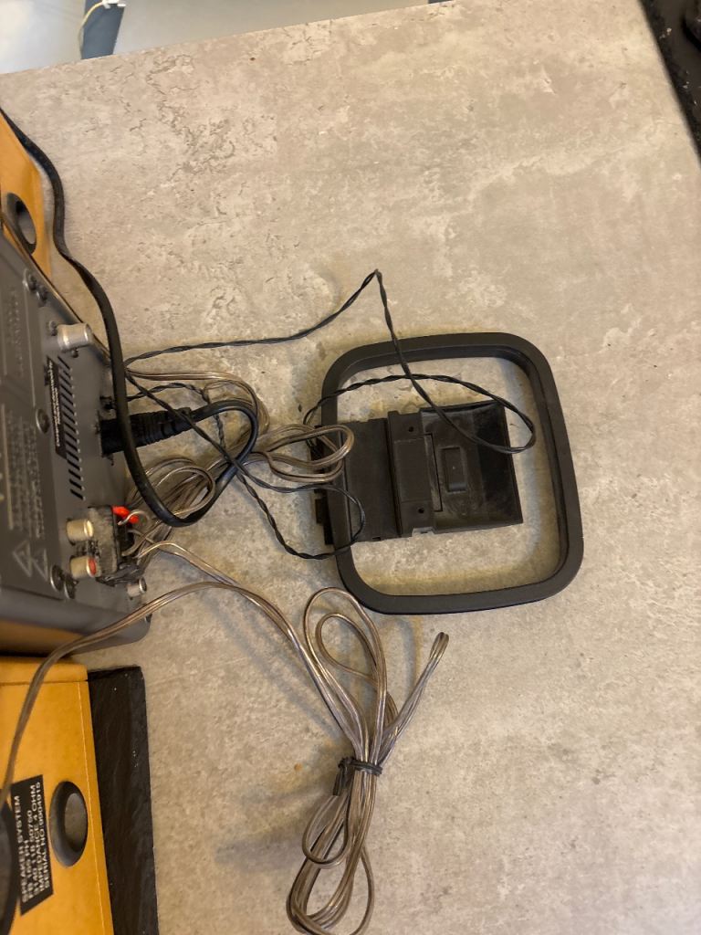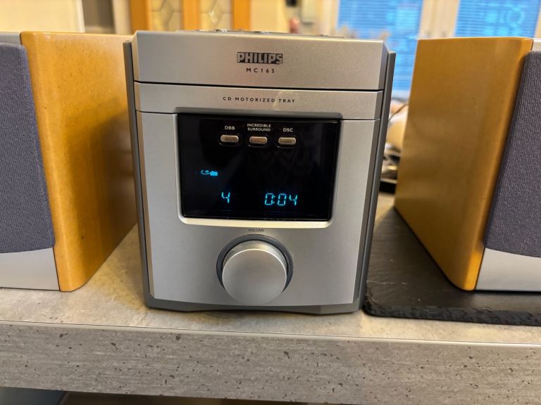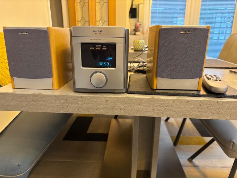 Excellent condition CD/ radio player. A type Philips MC 165. Complete with remote control and cable. Size is 9”dept and when all three bits together is 15.5” wide. Each speaker is 5” wide and have cable enough for separate location placing.