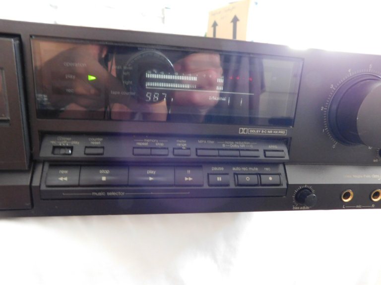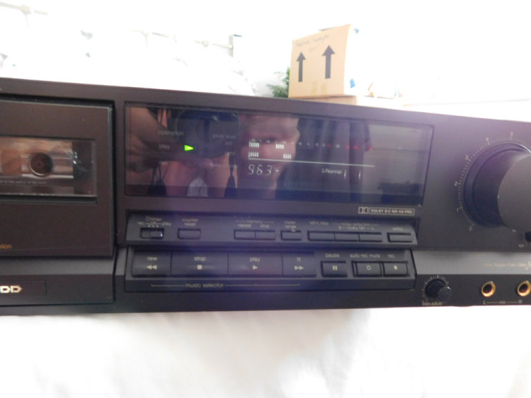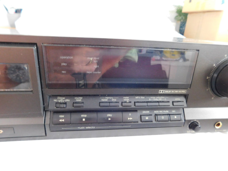 Typical front loading cassette deck with the cassette compartment located on the left side of the deck. Tape eject is operated mechanically and the cassette needs to be placed with the side to be played facing forward in the cassette well.