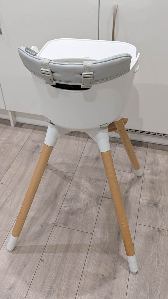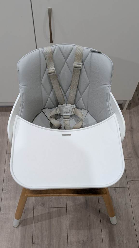A very sturdy high chair with a cushioned seat cover and a 5 point harness. Wooden legs with an adjustable foot rest.