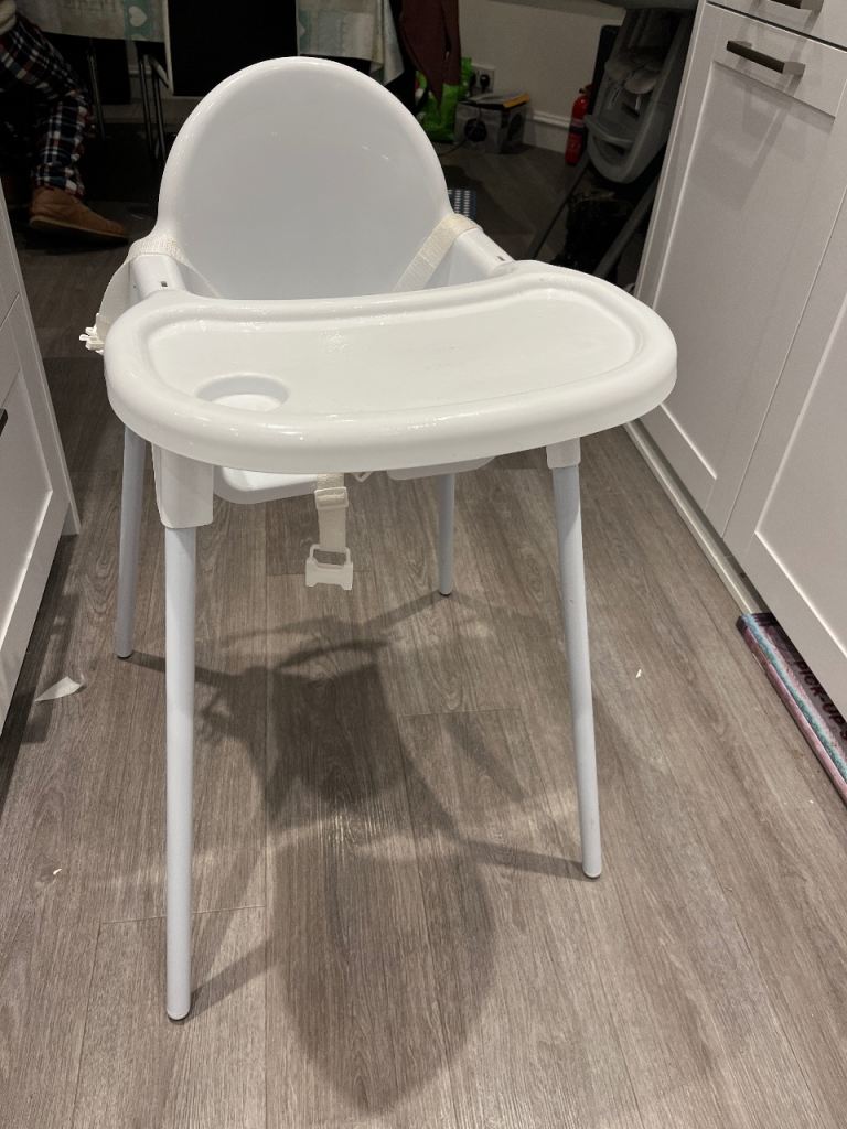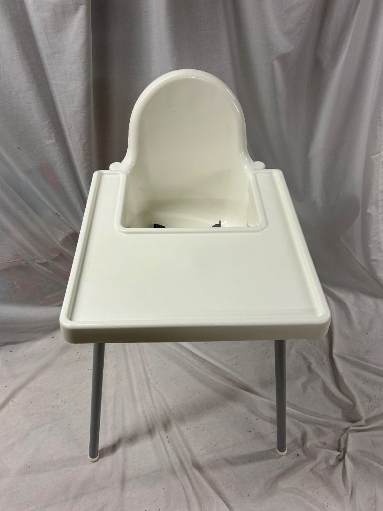 Height adjustable and chair also reclines backwards. Tray is removable.