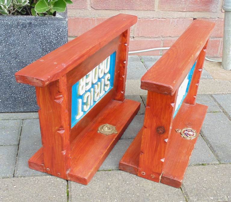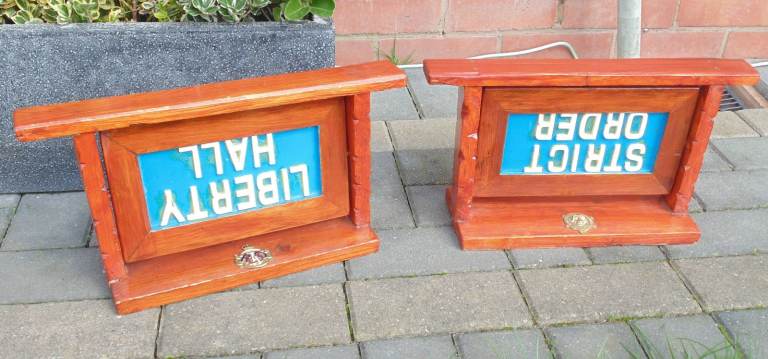 Here we a have a pair of Royal Antediluvian Order of Buffaloes liberty hall strict order signs .These have been hand made using wood with plastic letters glued ( please note the glue used as they have not done a neat job). They are in an ok condition but looks like they have been built by an amateur as they lack quality. Please see attached pictures for condition. (#1352)