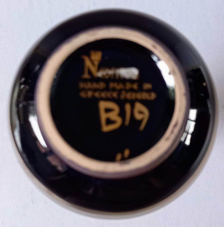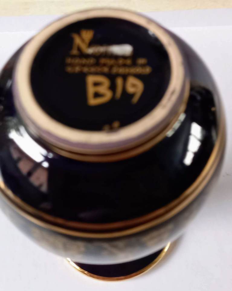 BEAUTIFUL BLUE & GOLD (24K) VASE. GREEK KEY. HANDMADE IN GREECE IN 70s. APPROX SIZE 4.5” H X 2” DIA