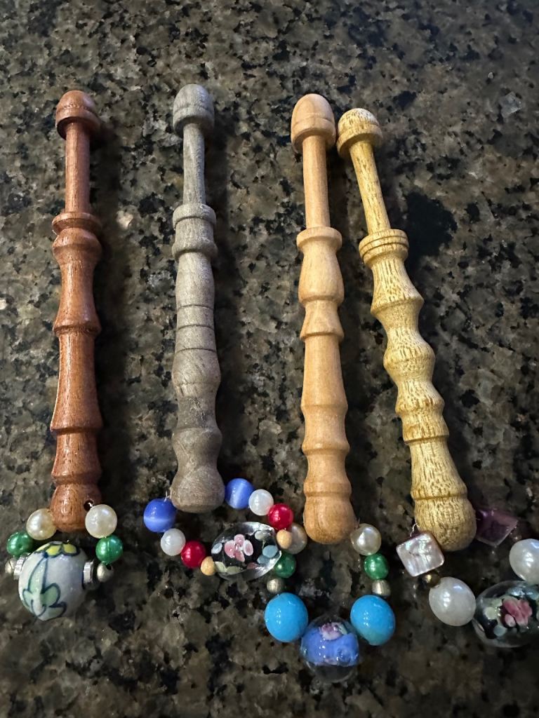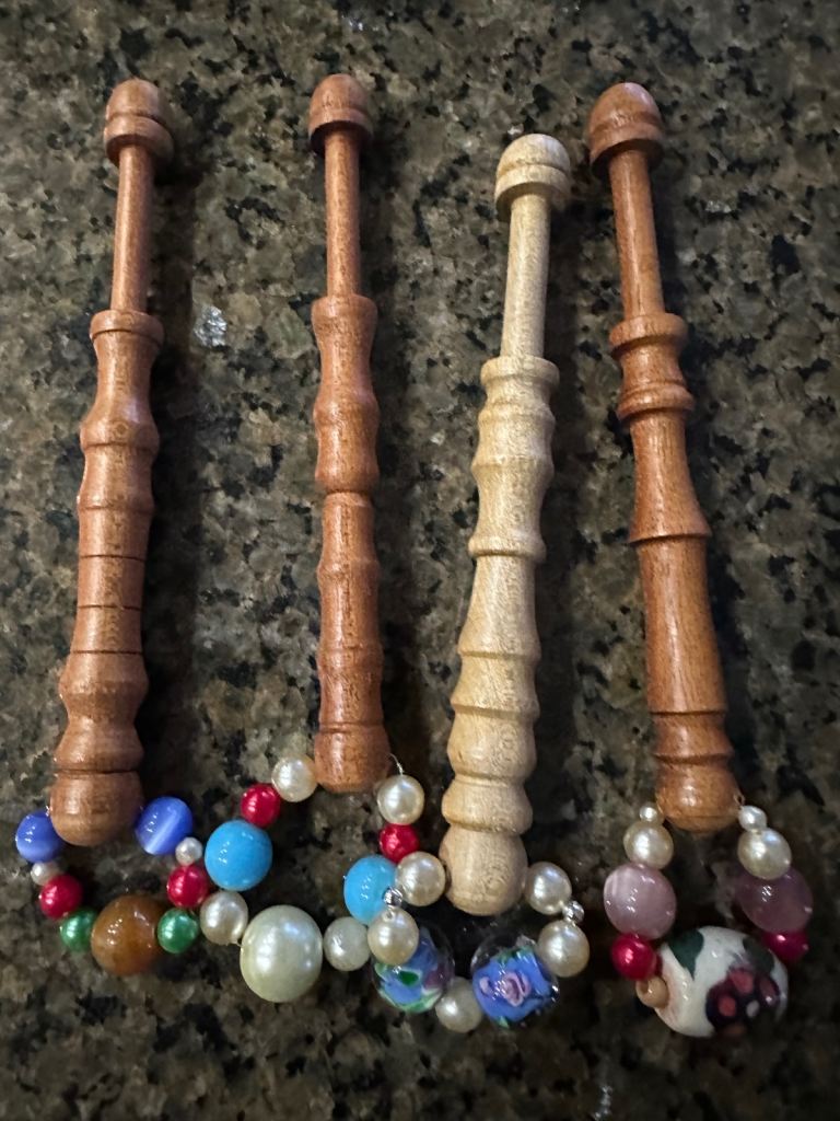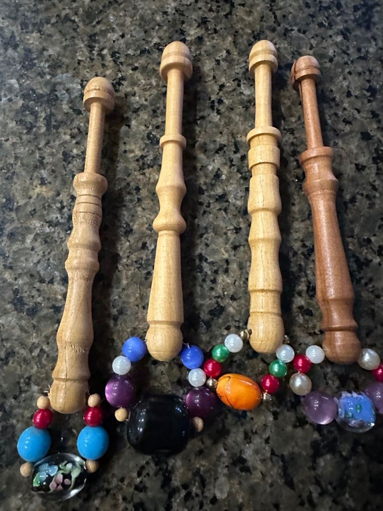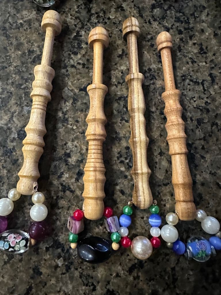 16 extra large lovely spangled wooden lace bobbins. Ideal for lace makers struggling with hand movements or arthritis but still enjoys the hobby. Each bobbin is 12cm long so easy to hold and work with.