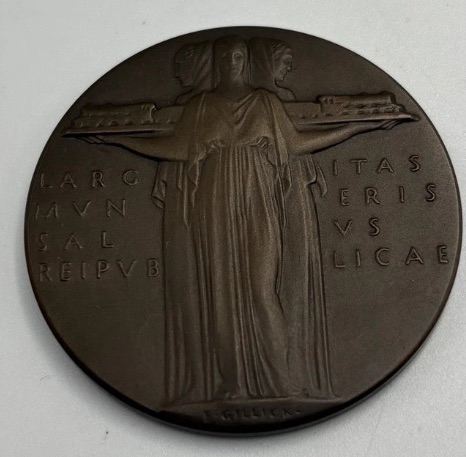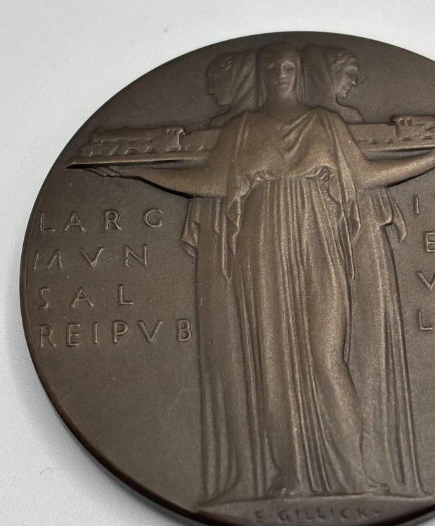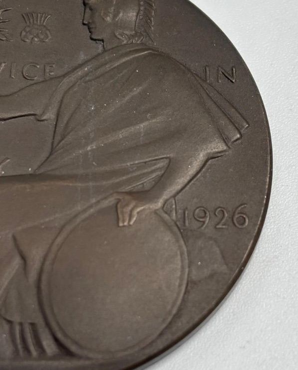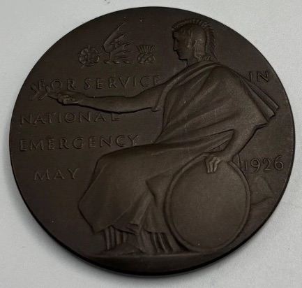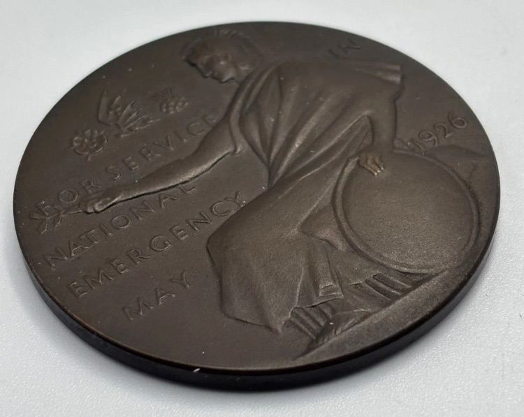 Pre-owned 1926 bronze "For Service in National Emergency May 1926" medal, housed in its original fitted presentation case. The obverse shows a seated classical figure with the inscription "FOR SERVICE IN NATIONAL EMERGENCY MAY 1926" and floral emblems. The reverse depicts a three-figure standing design with Latin text and is signed "E. GILLICK" at the base. The medal appears to be bronze and is uncleaned.